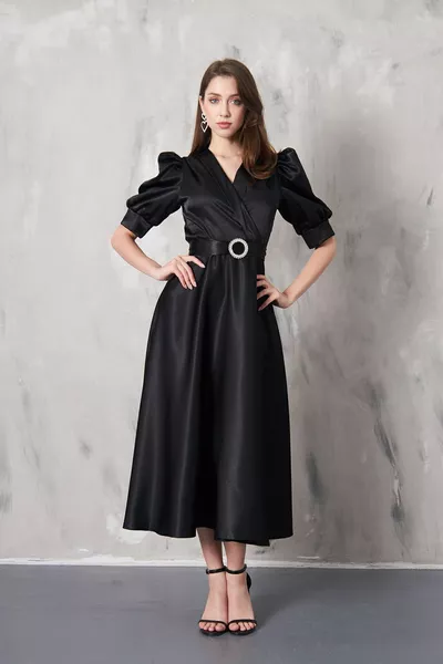 فستان سهرة من الساتان وفستان سهرة مع تفاصيل دانتيل مطرزة باللون الأسود