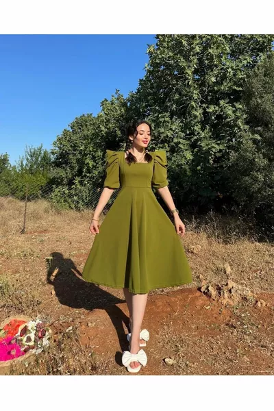 الأميرة كم تنورة انتفخ مربع الرقبة ميدي طول كريب النسيج مساء اللباس الزفاف الخطوبة دعوة الوعد