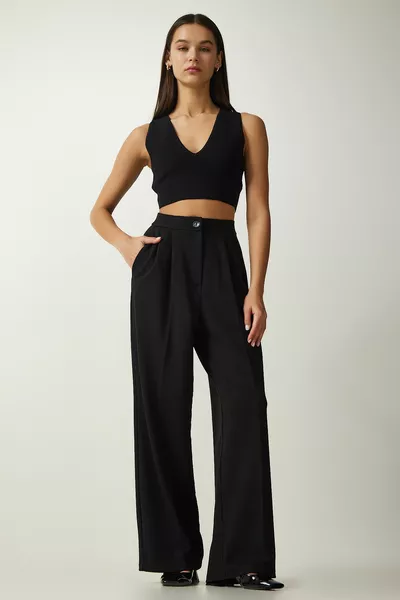 المرأة السوداء عالية الخصر بيك اب الإسبانية الساق Palazzo السراويل