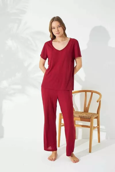 المرأة بورجوندي طويلة الأكمام القطن أزرار Welt بيجامة مجموعة