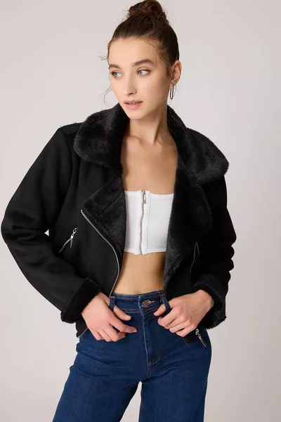 المرأة السوداء مزدوجة جيب بسحاب المحاصيل الدنيم سترة