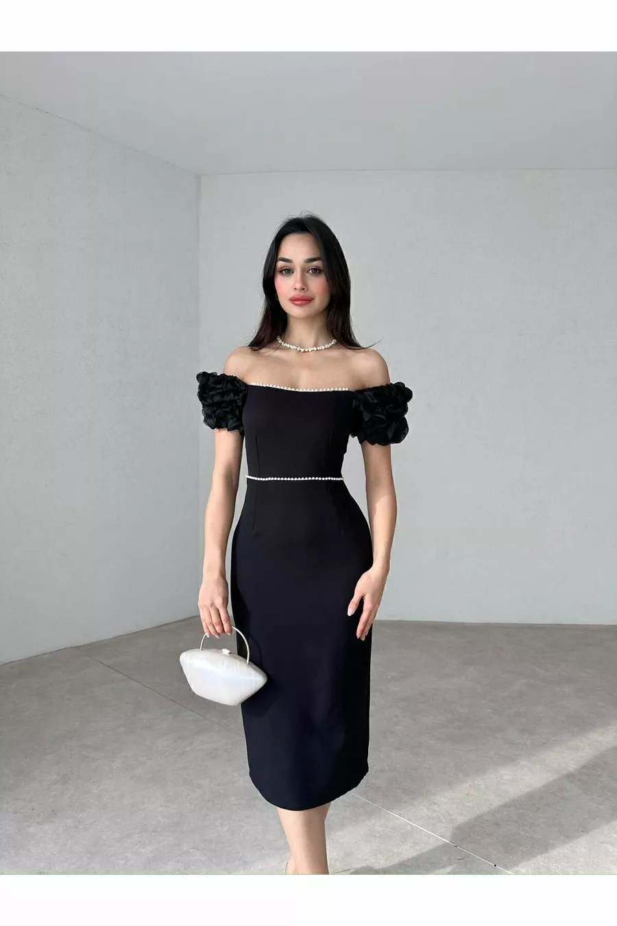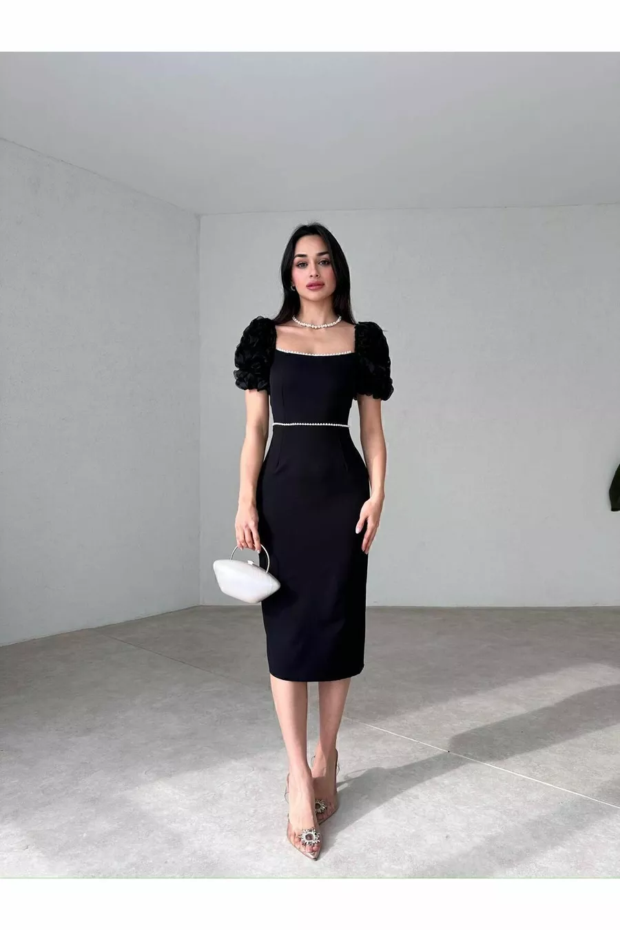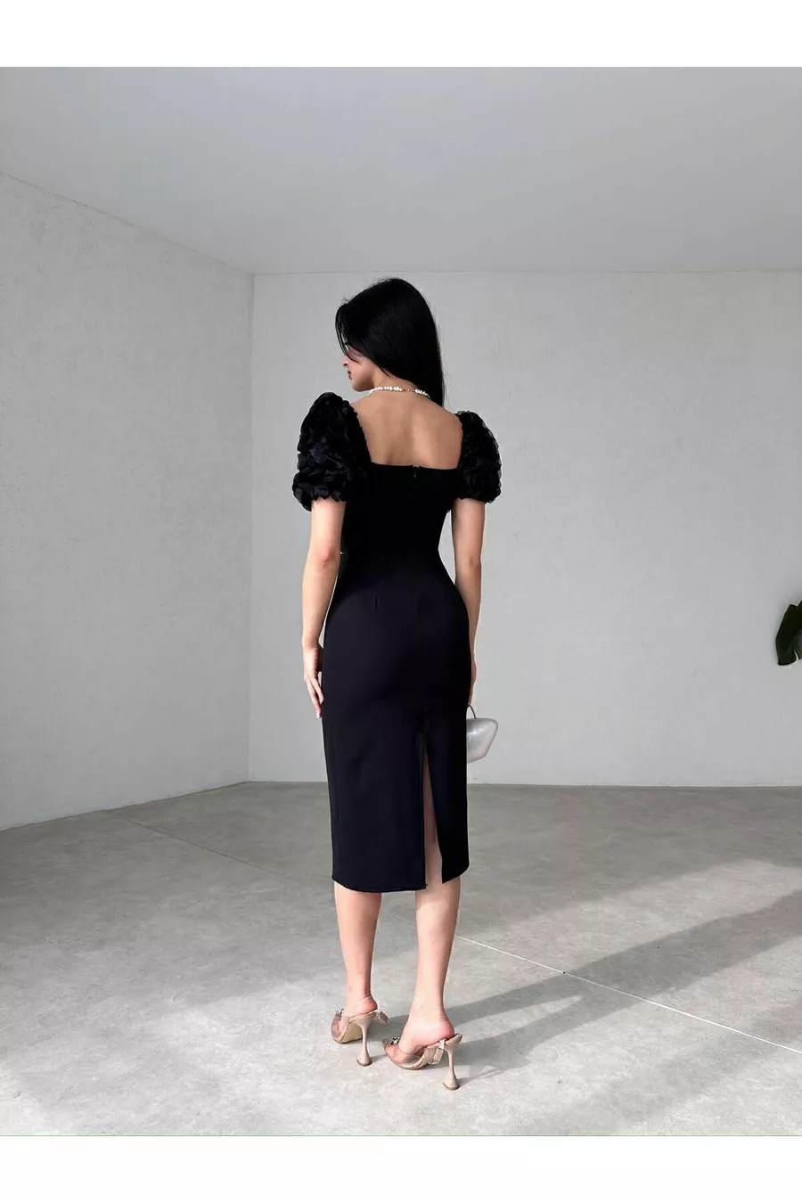 أسود كشكش الأكمام اللؤلؤ مفصلة شق أنيق أنيق ميدي اللباس