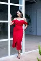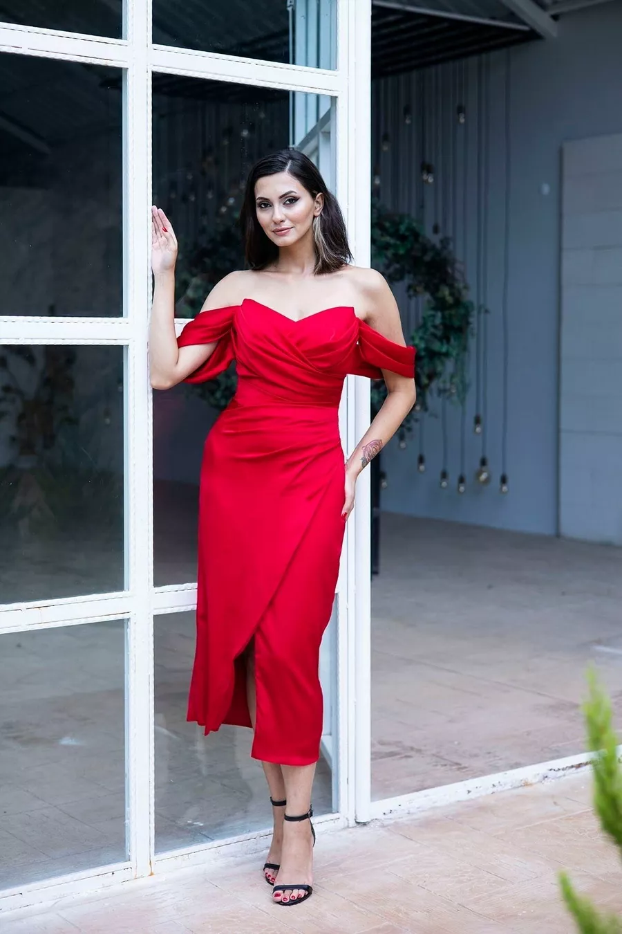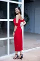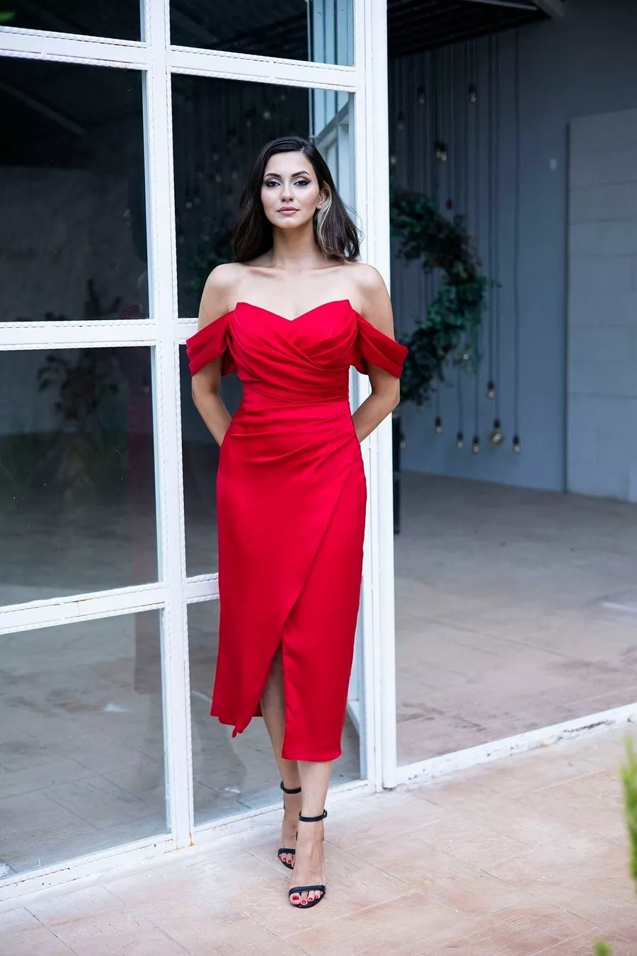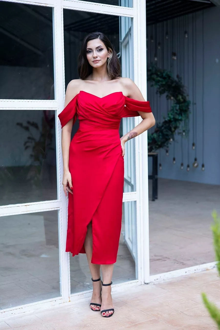 الأحمر انخفض الكتف المتوسطة الساتان مساء اللباس