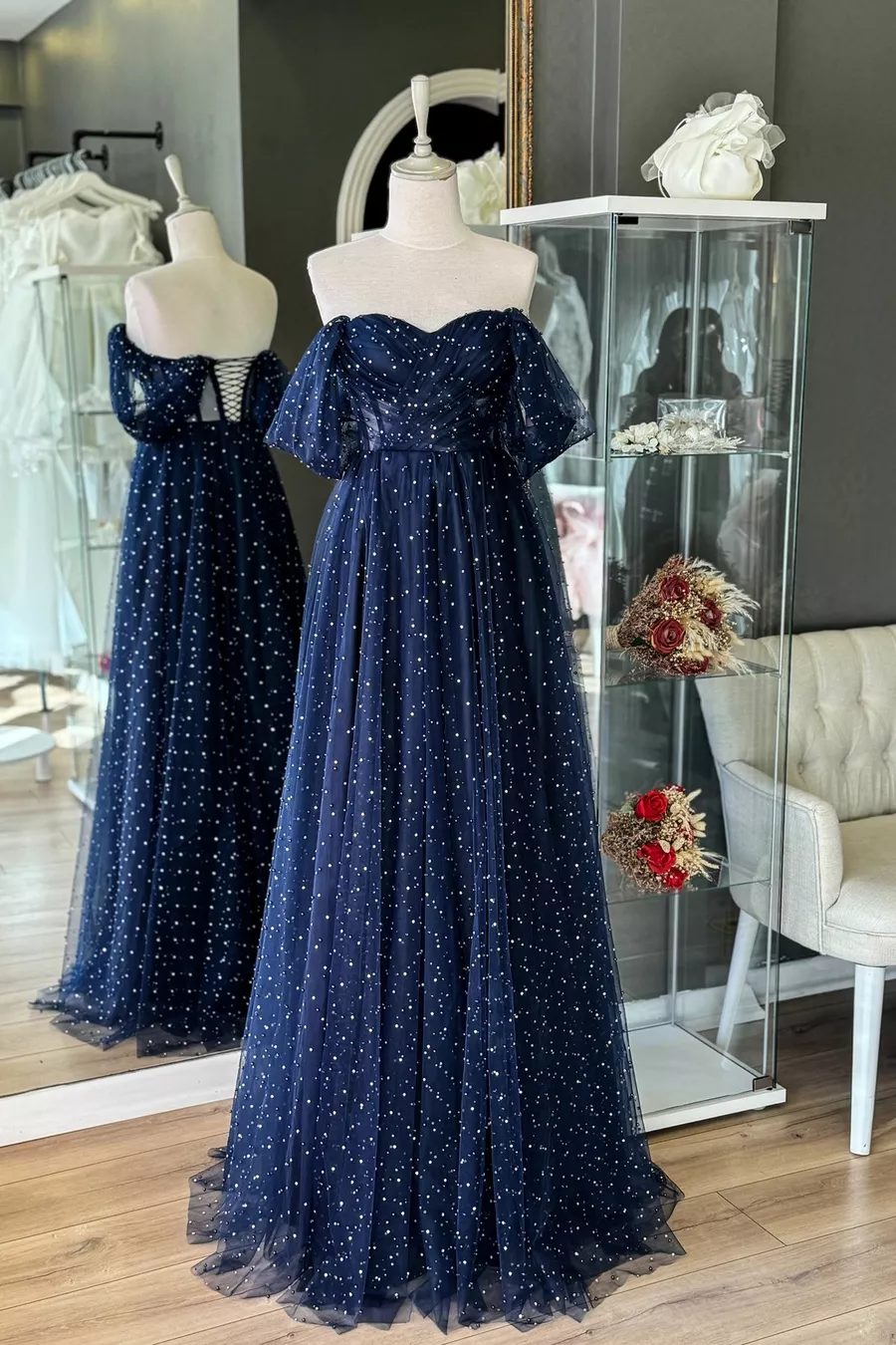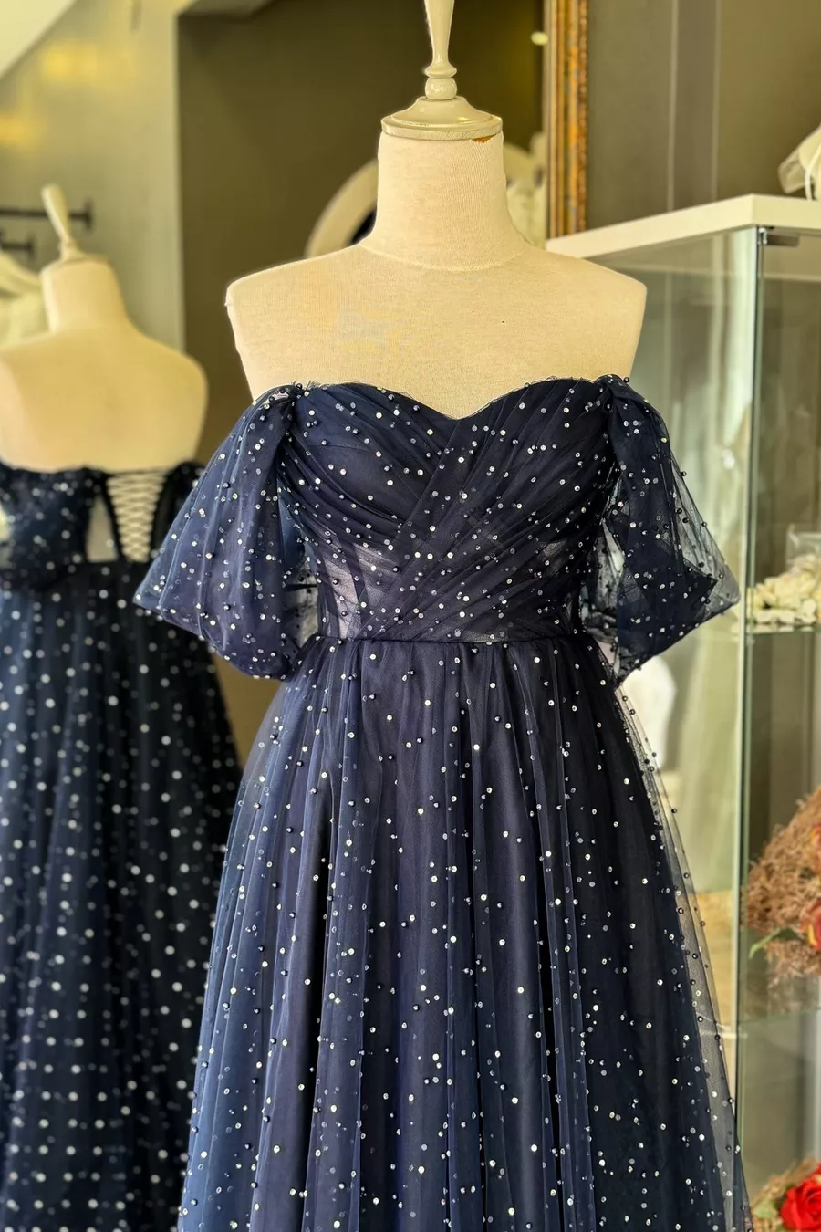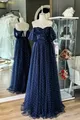 الأزرق الداكن اللؤلؤ والحجر المتلألئ ماكسي طول رايات شفافة مساء اللباس والسهرة اللباس