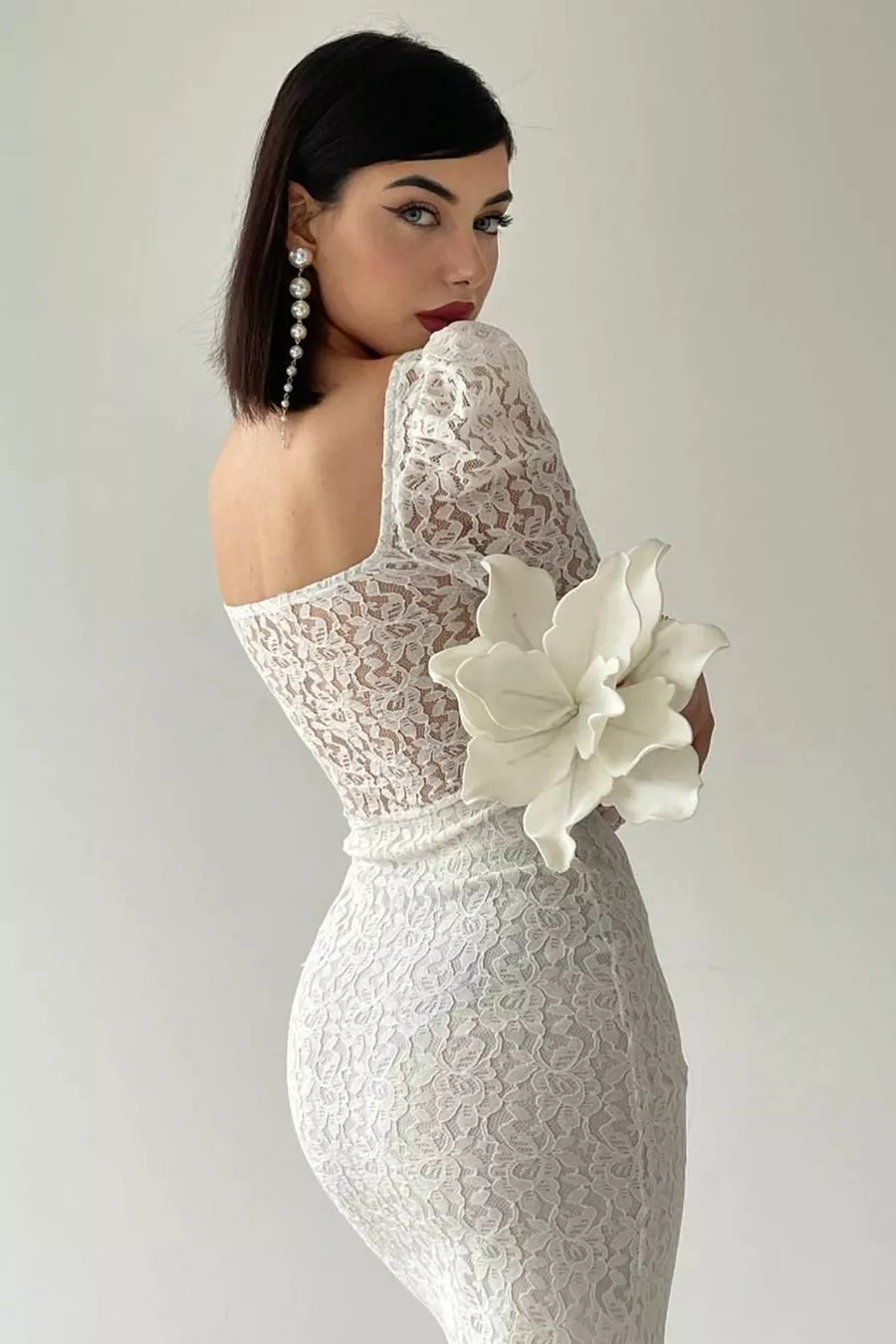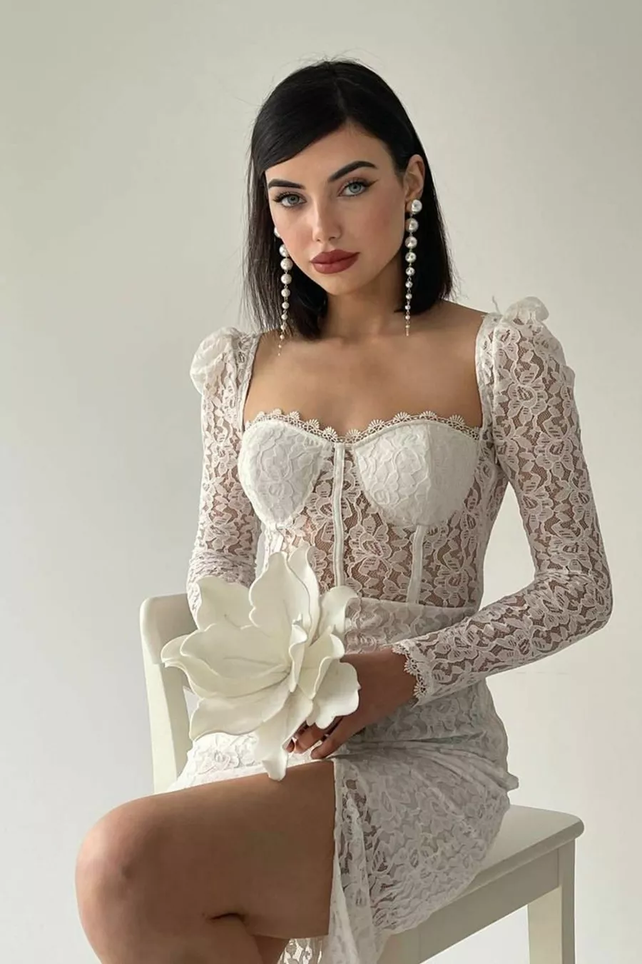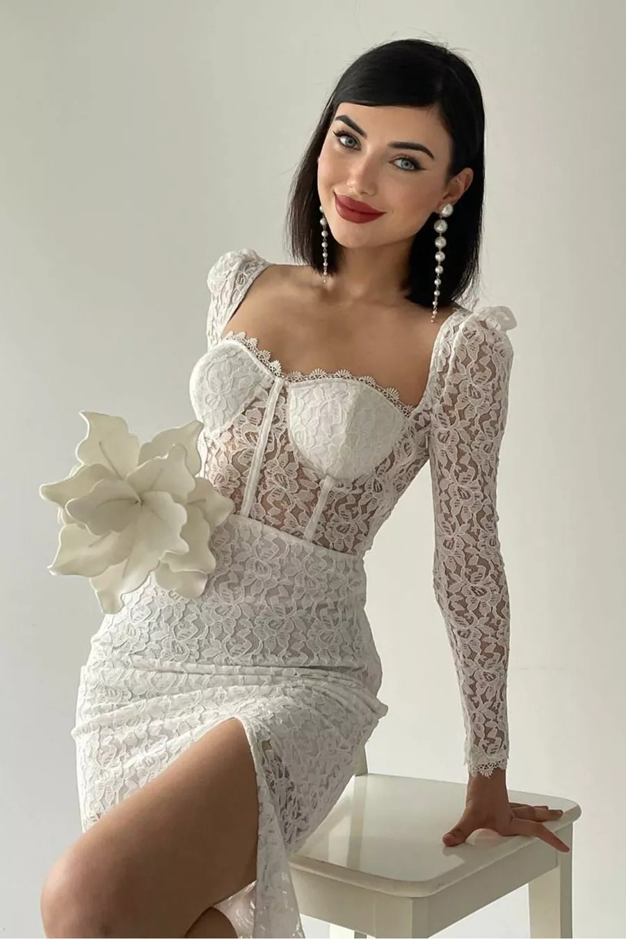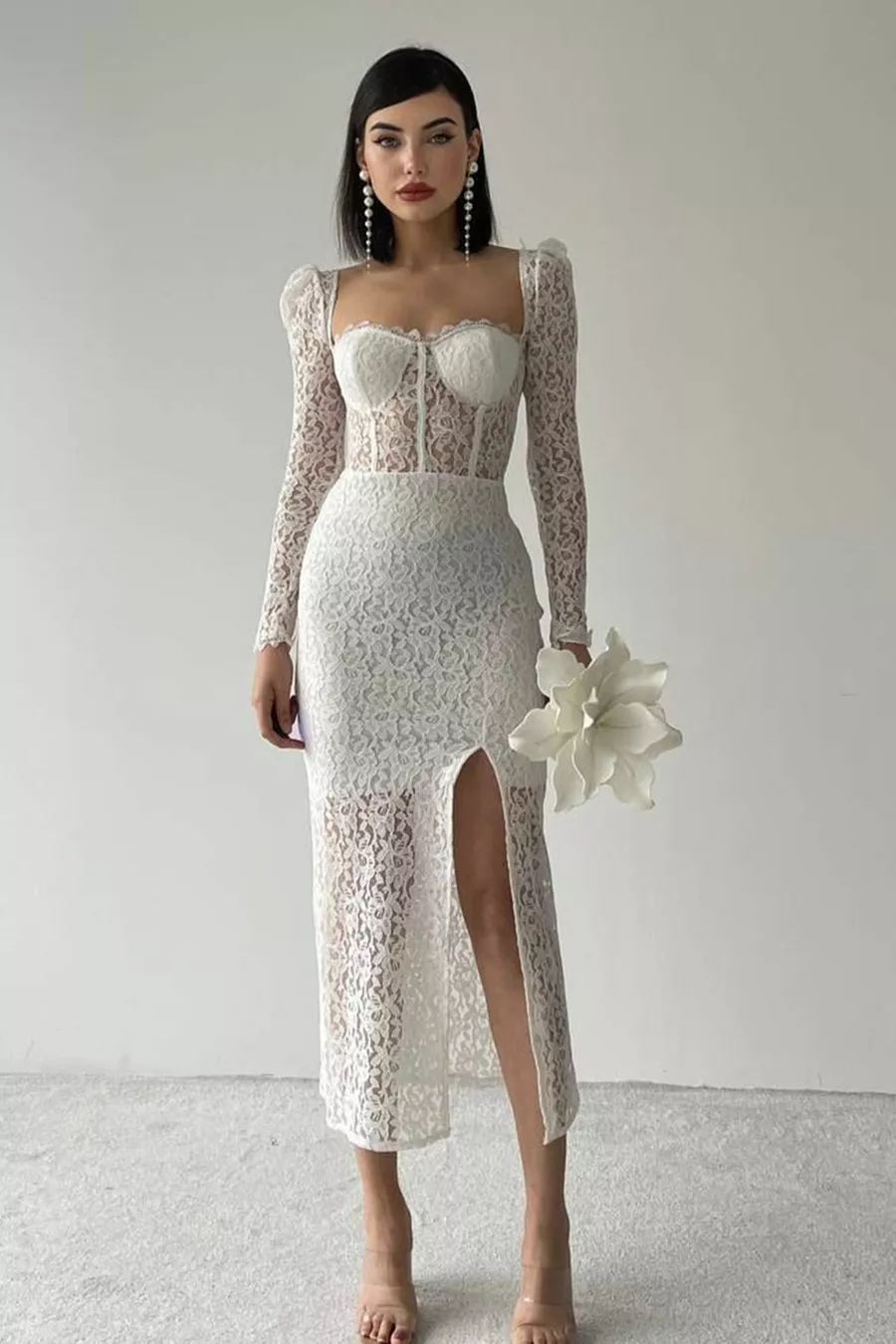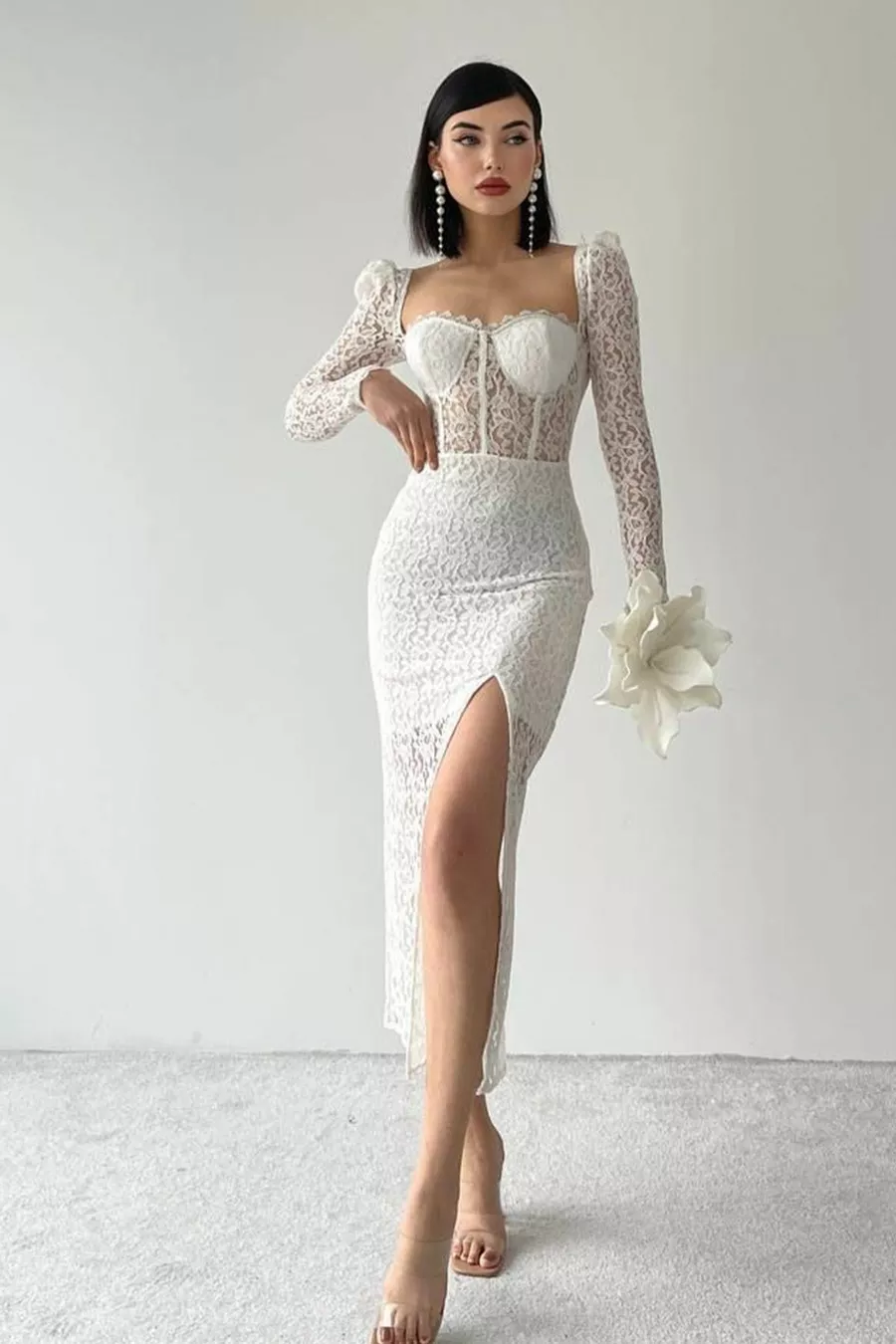المرأة الدانتيل النسيج الأكمام شفافة جبر تصميم شق مفصلة الأبيض ميدي مساء اللباس