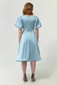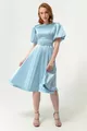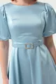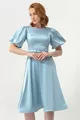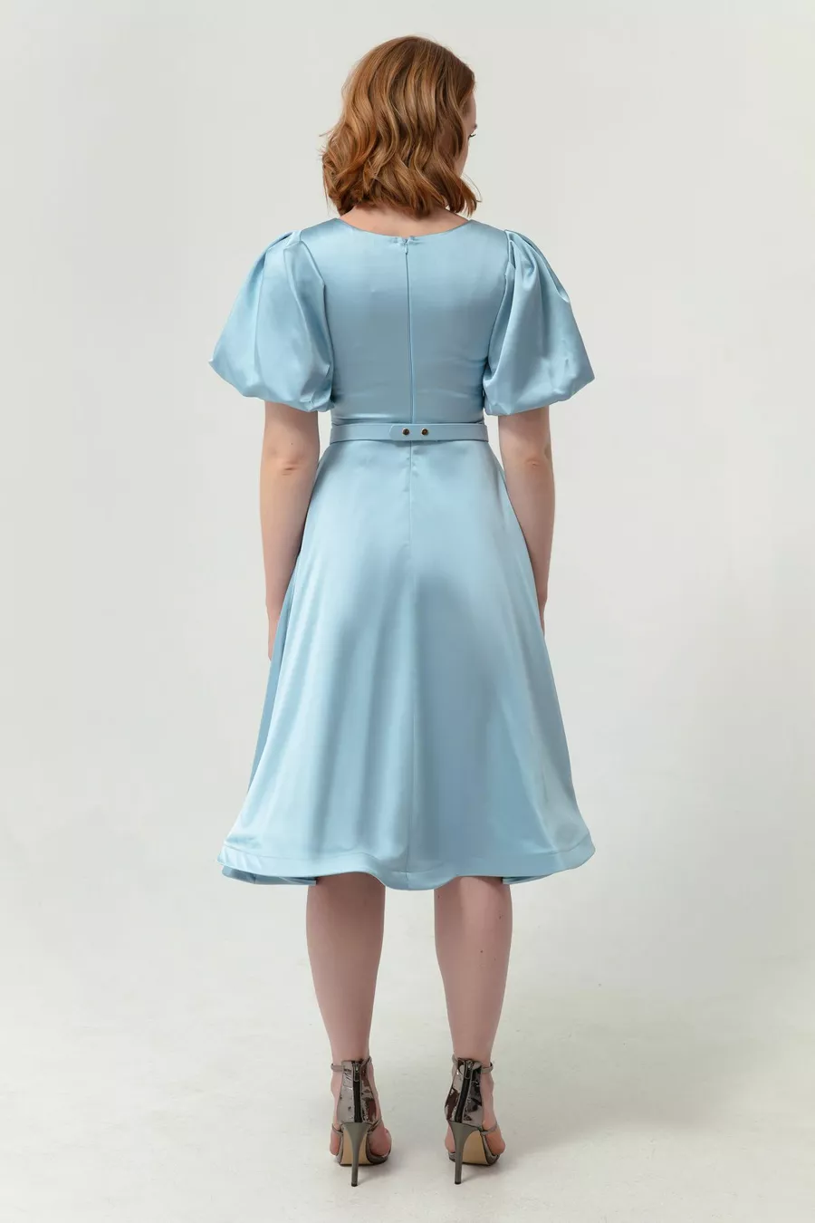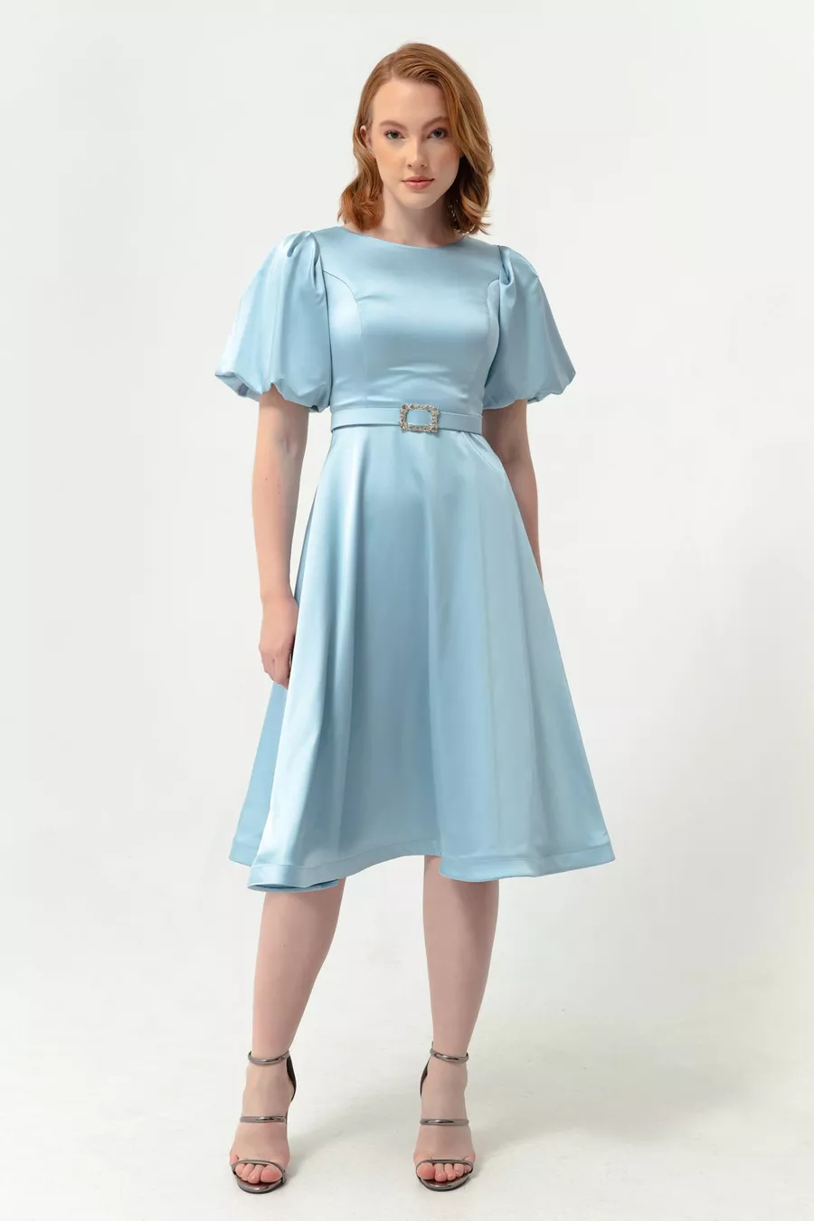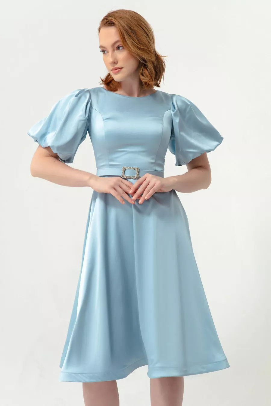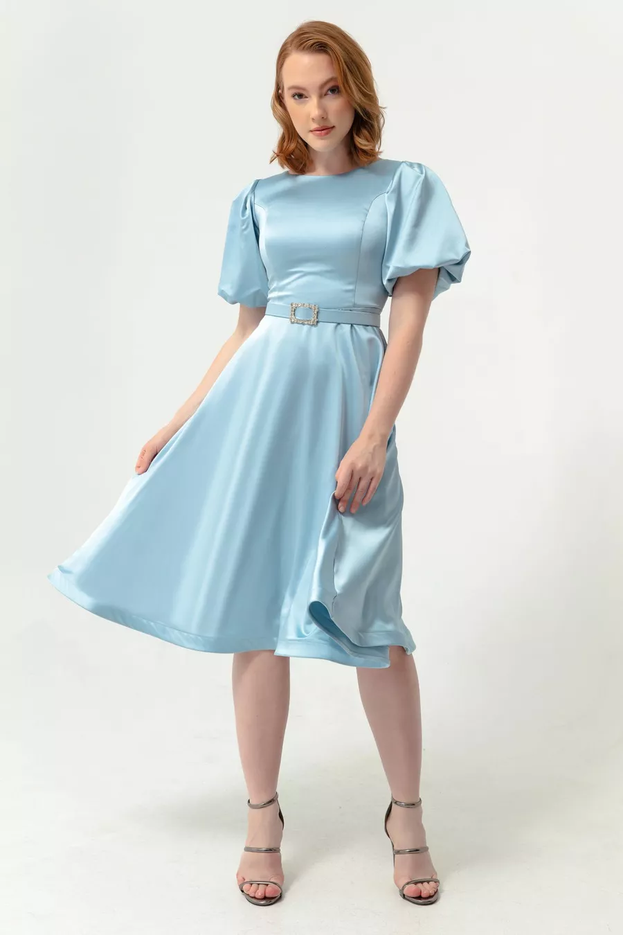 المرأة الطفل الأزرق بالون الأكمام البسيطة الساتان مساء اللباس مع الحجر حزام