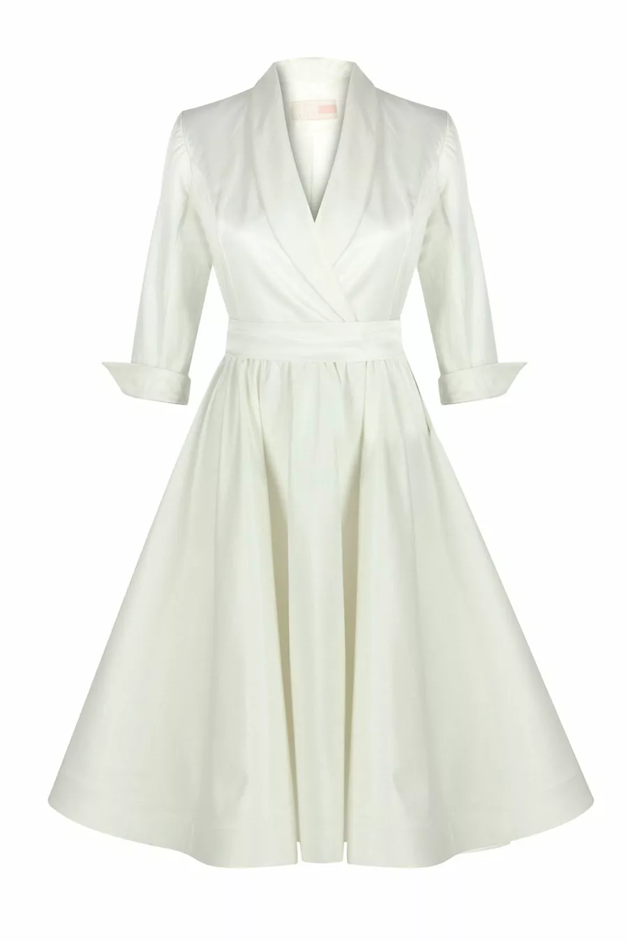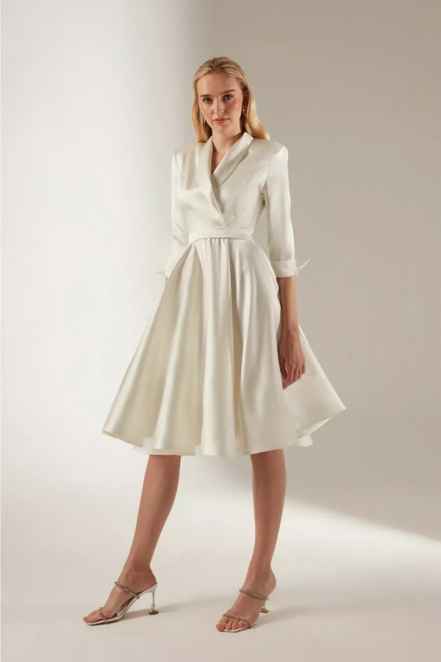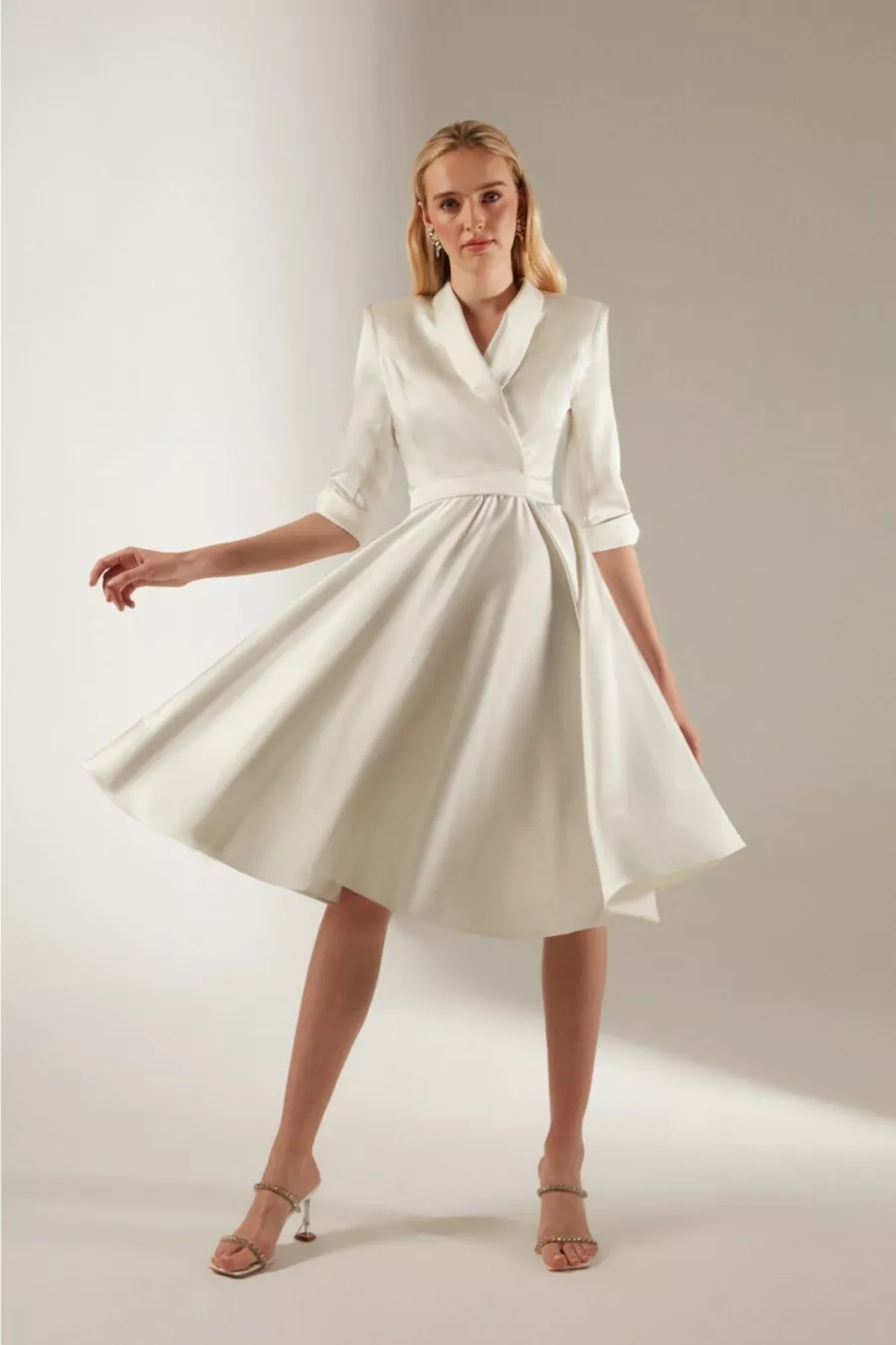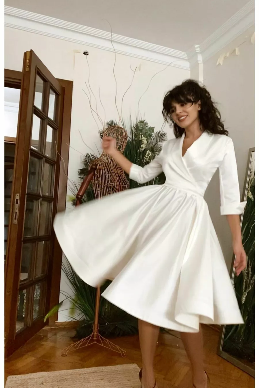 المرأة انتفخ مزدوجة الصدر فستان الساتان الأبيض