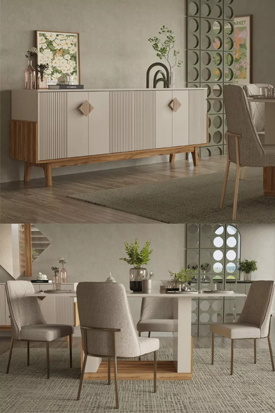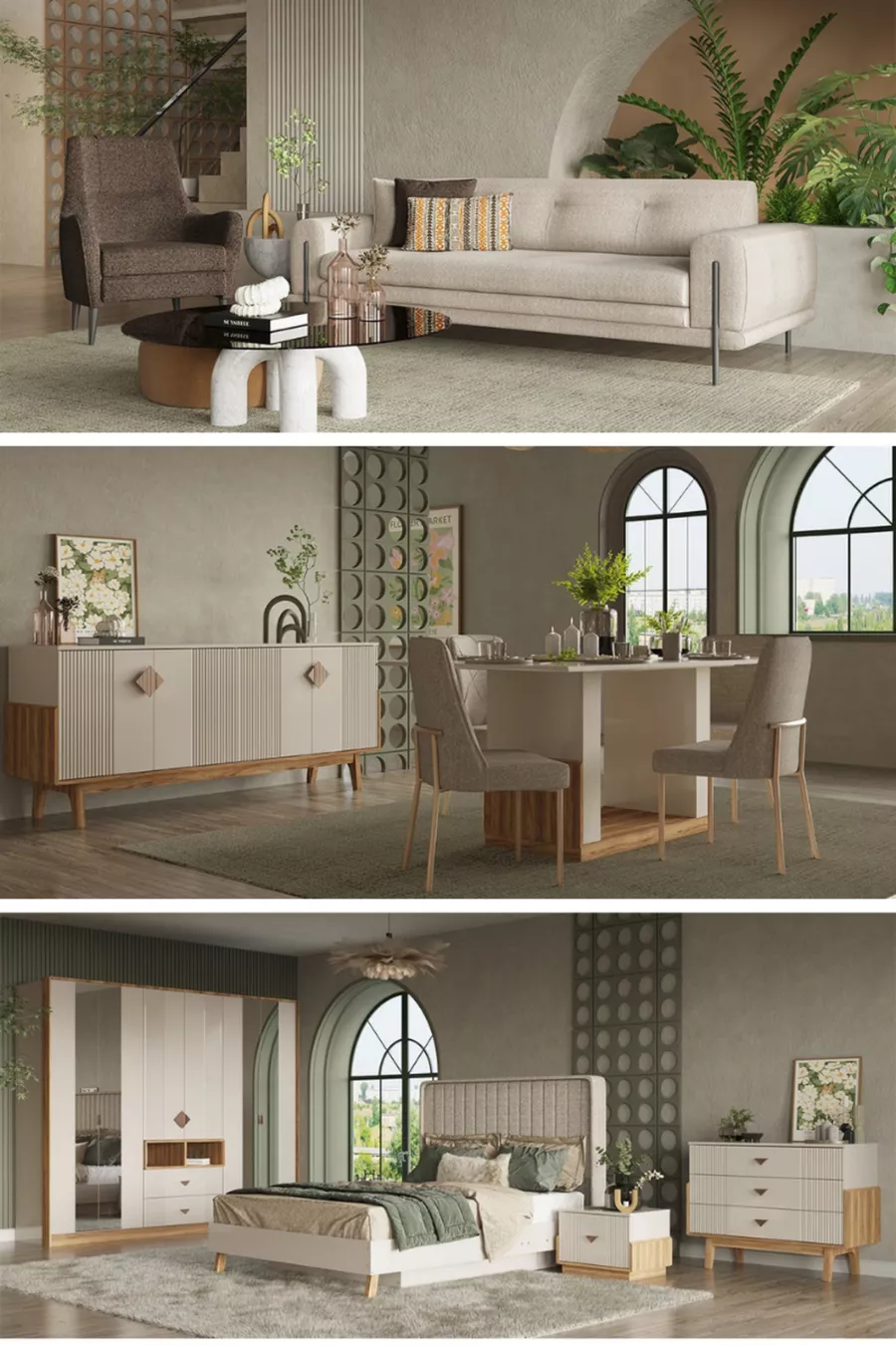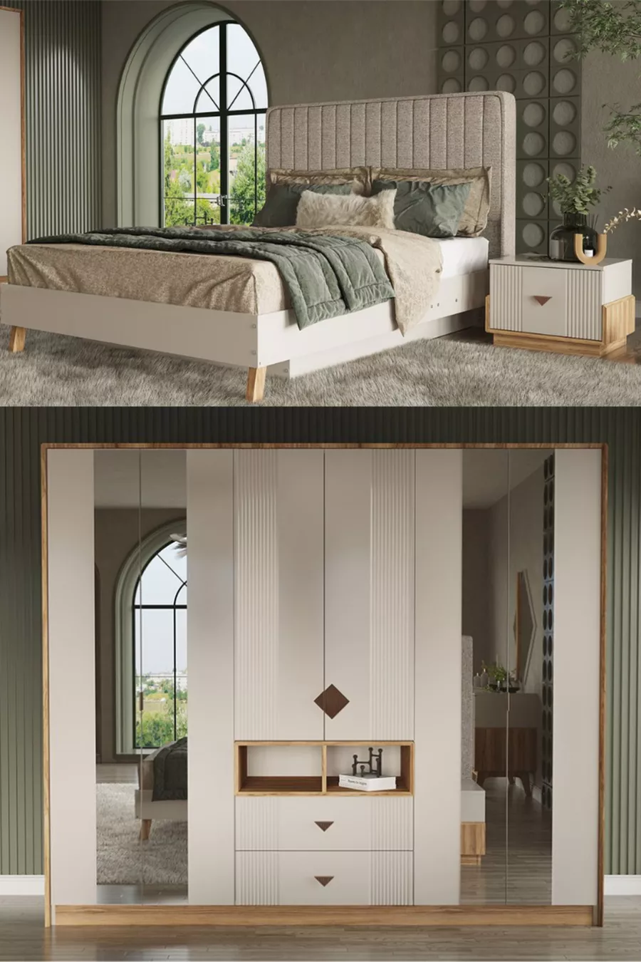 محتويات الطقم: خزانة + 2 منضدة جانبية + كومودينو + رأس سرير