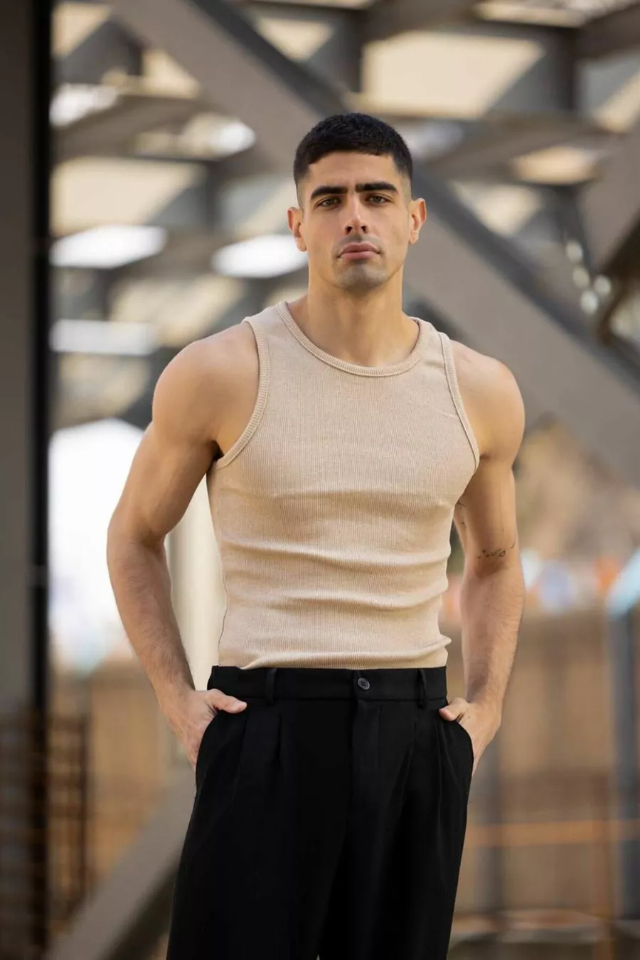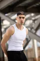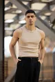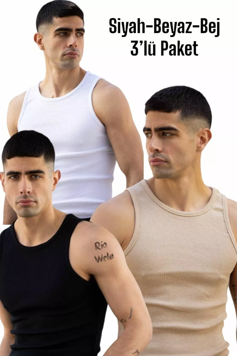 باقة من 3 قمصان رياضية رجالية بلا أكمام برقبة هالتر بكرة ليكرا، ألوانها أسود-أبيض-بيج