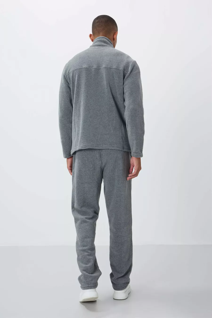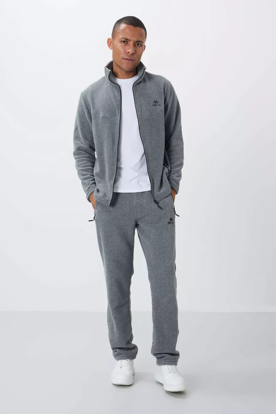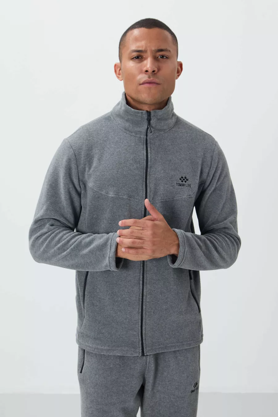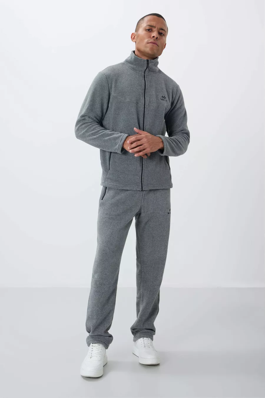 بدلة رجالية من البولار بلون رمادي ممزوج، بياقة عالية، سحاب، جيوب، مقاس قياسي -