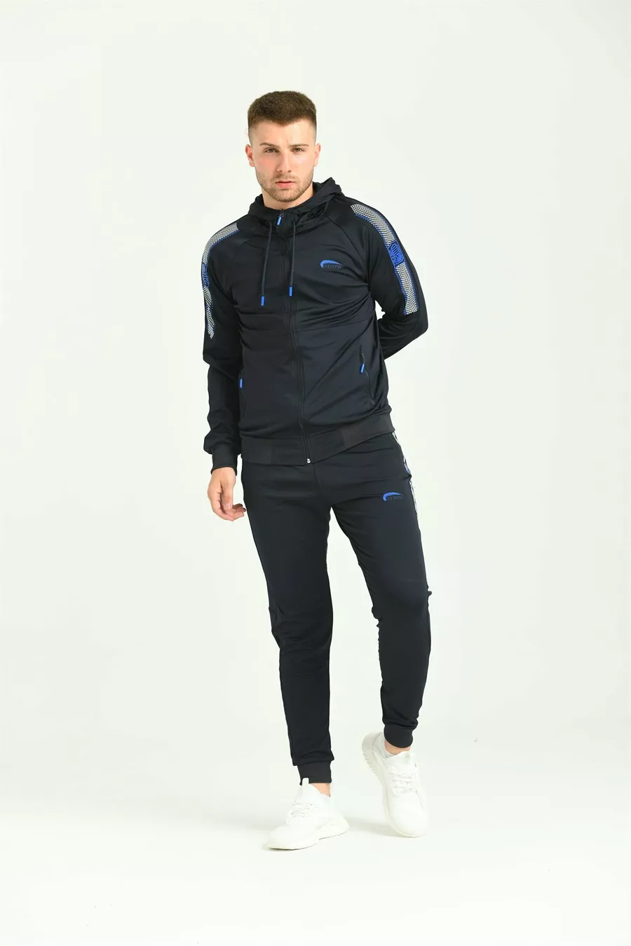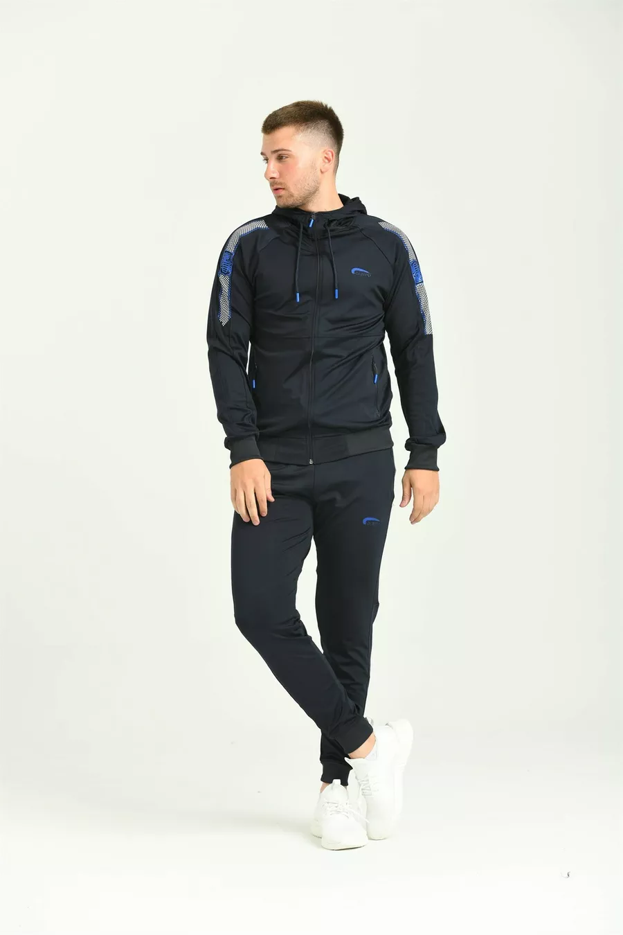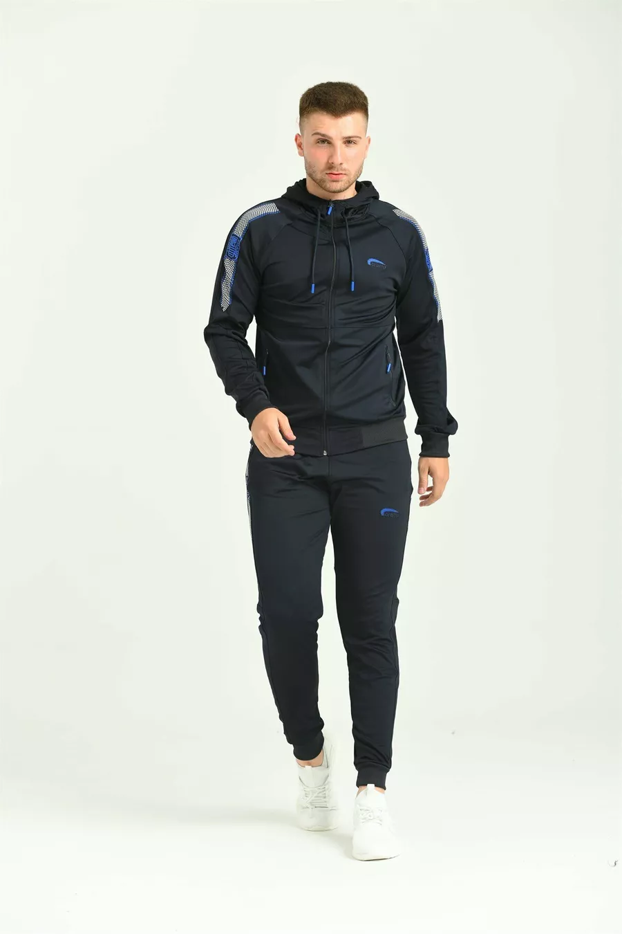 بدلة رياضية رجالية من نسيج الدانتيل الأزرق الداكن مع تطريز على الذراع