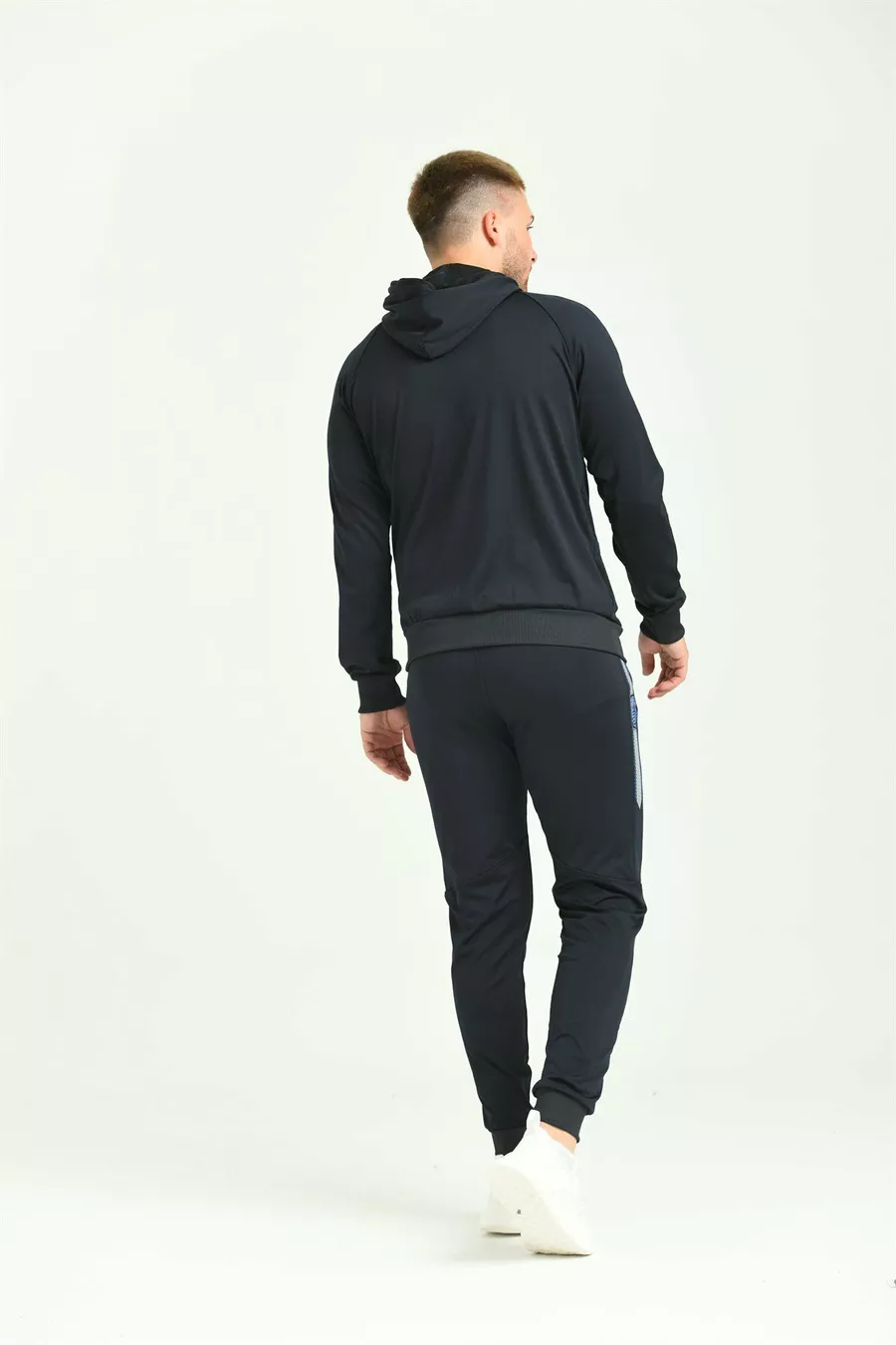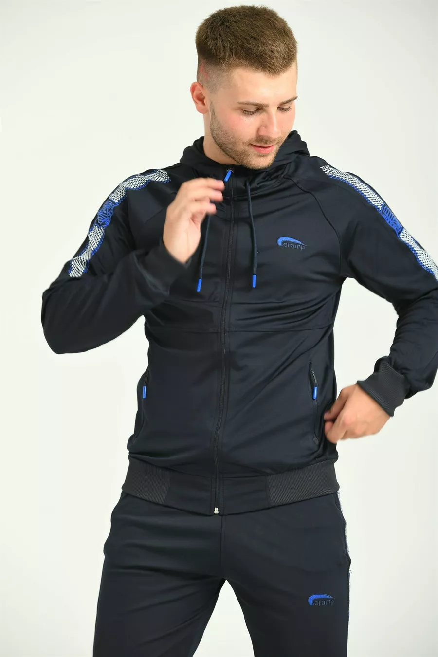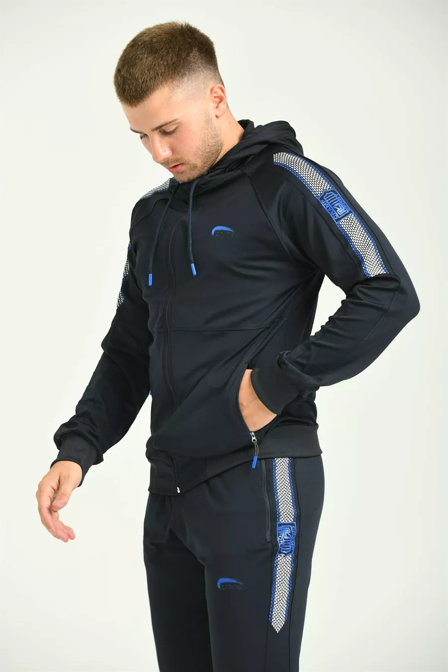 بدلة رياضية رجالية من نسيج الدانتيل الأزرق الداكن مع تطريز على الذراع