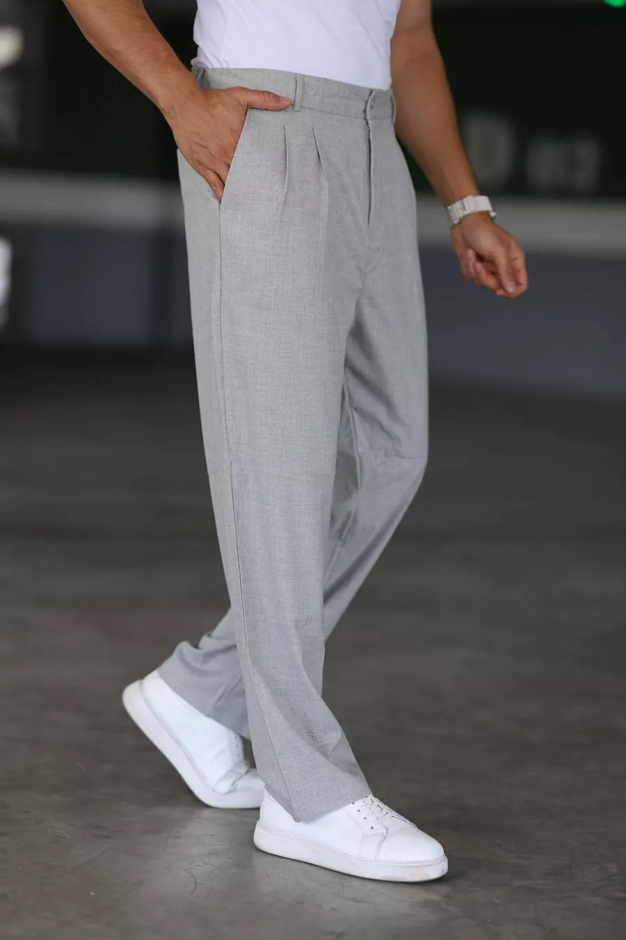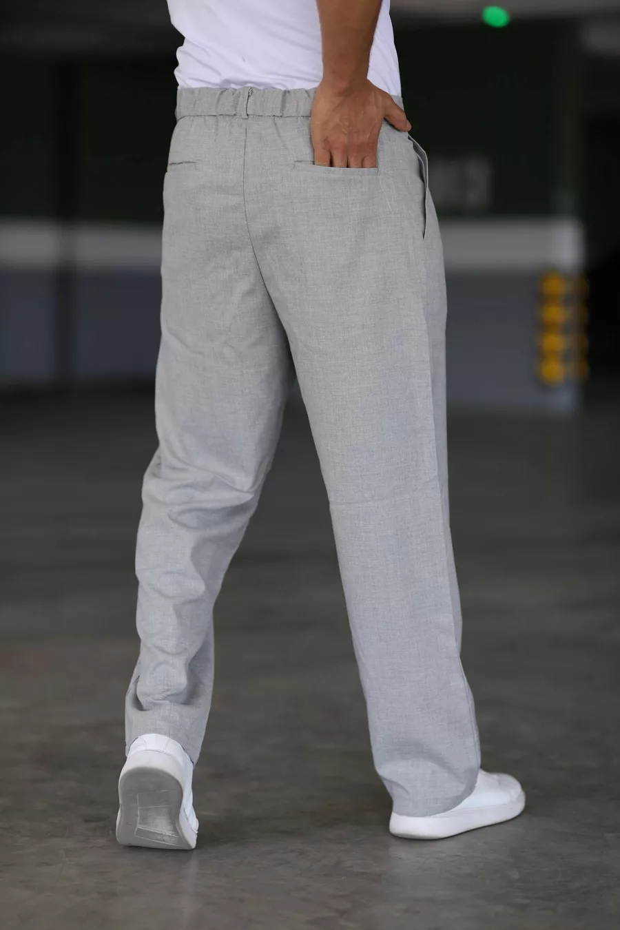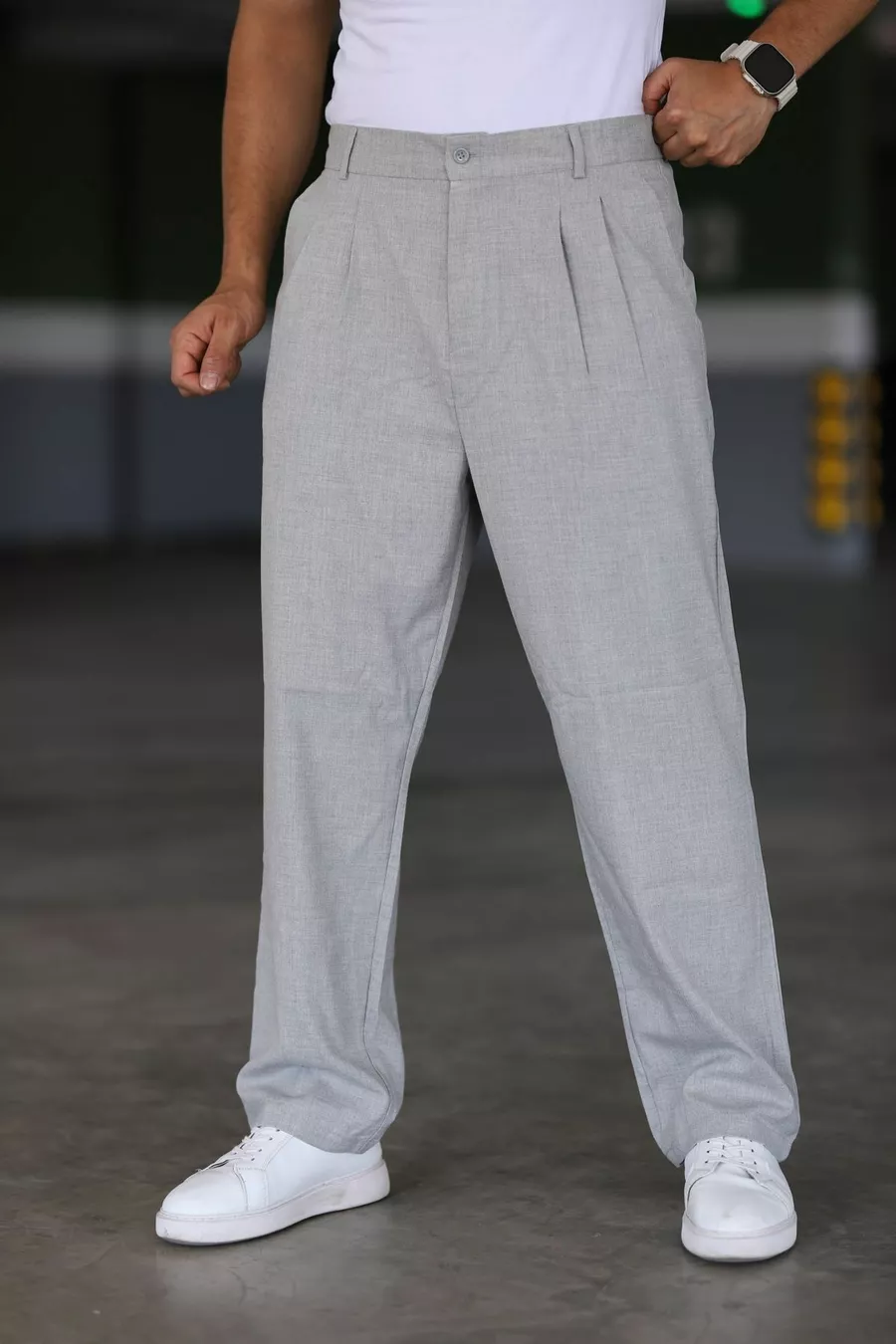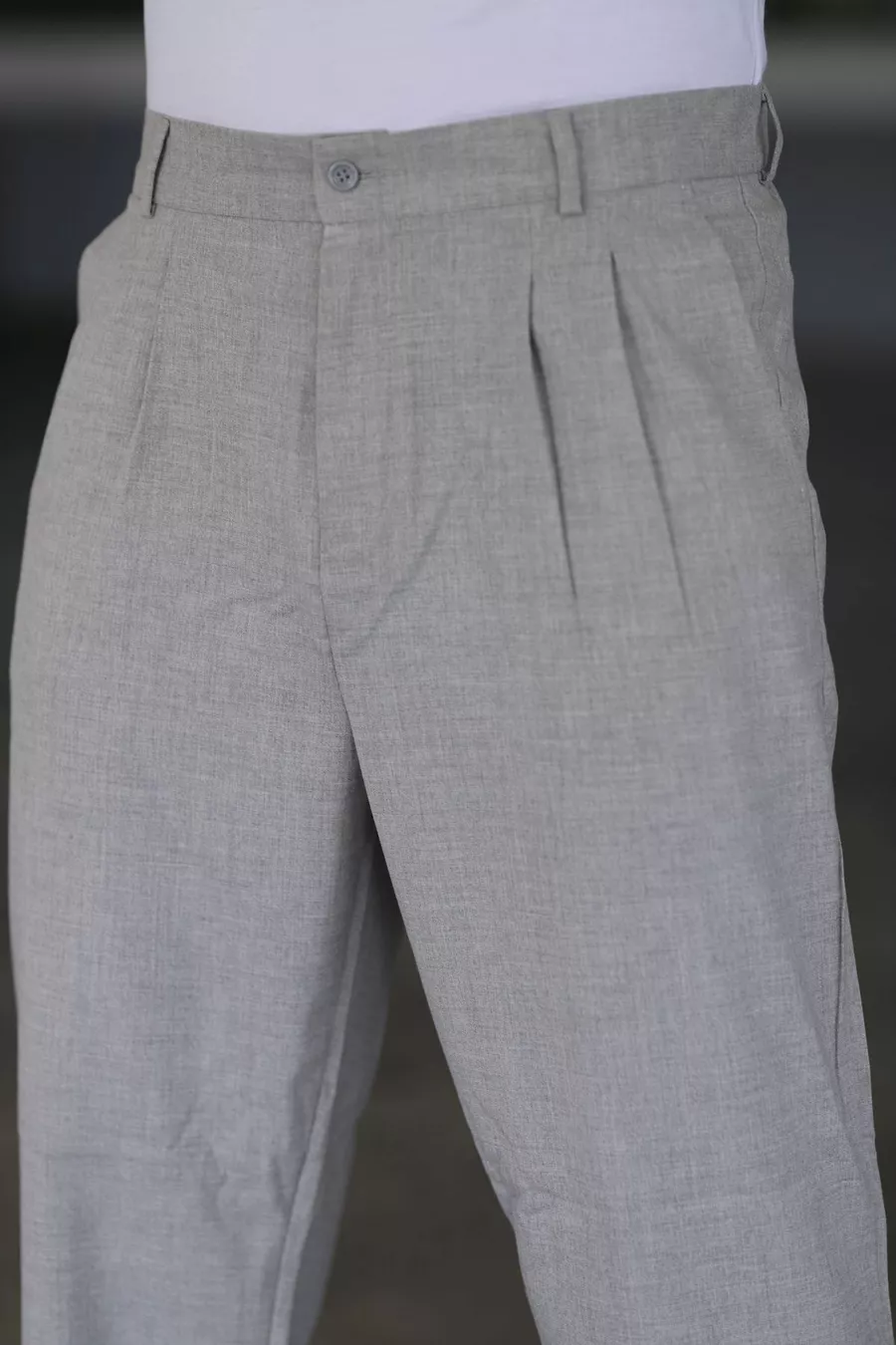 بنطال باجي رمادي اللون مزدوج الطيات، خصر مطاطي، عالي الجودة، مريح، قصّة كلاسيكية واسعة الساق