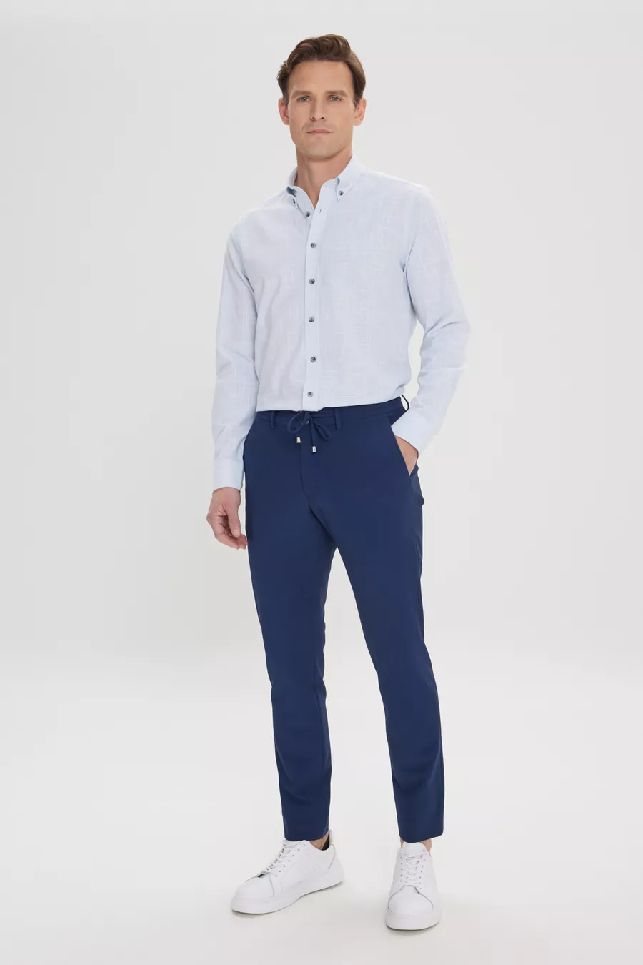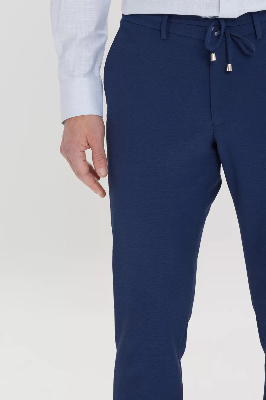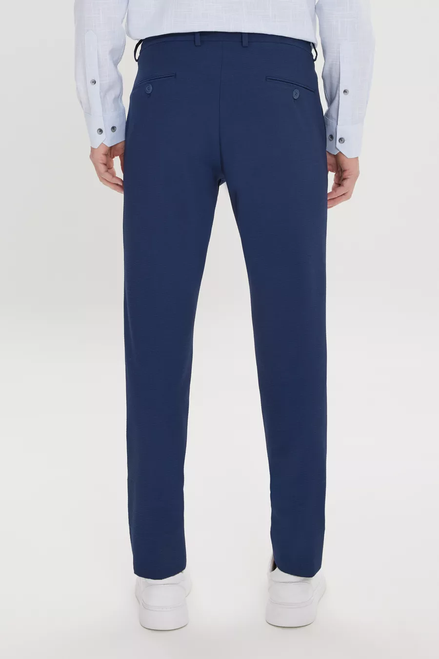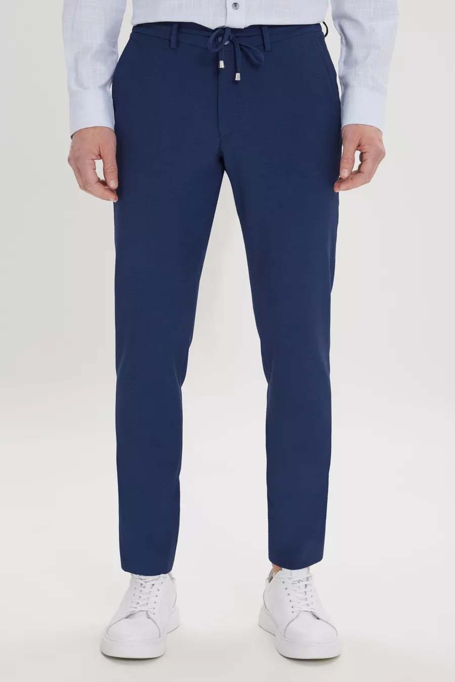 بنطال رجالي ضيق باللون الأزرق الداكن، قصّة نحيلة، مزود بحزام للخصر، وجيوب جانبية، بنقشة محززة