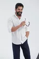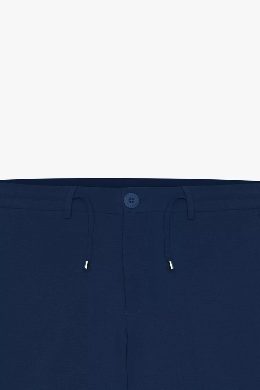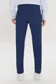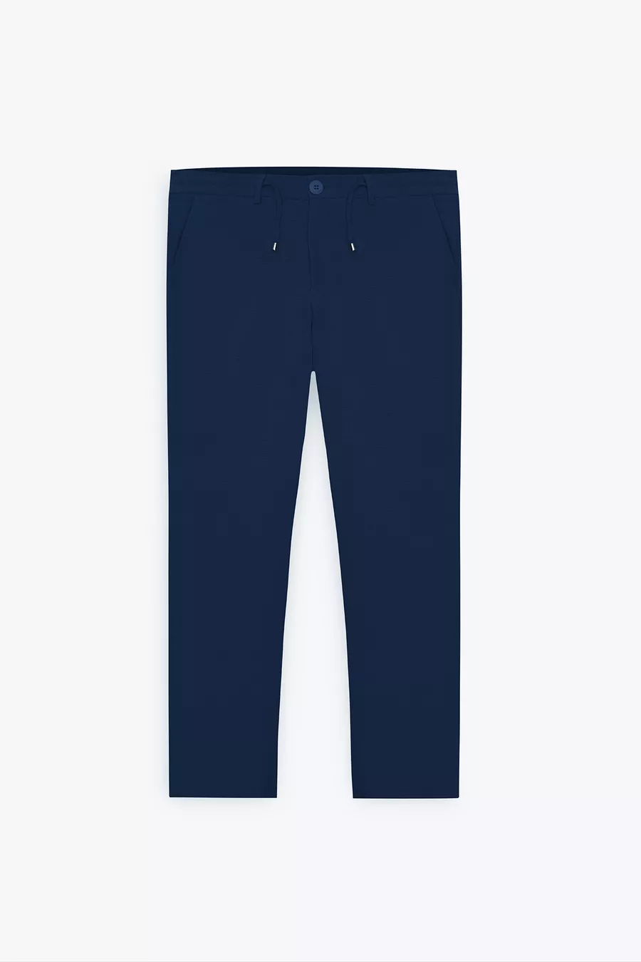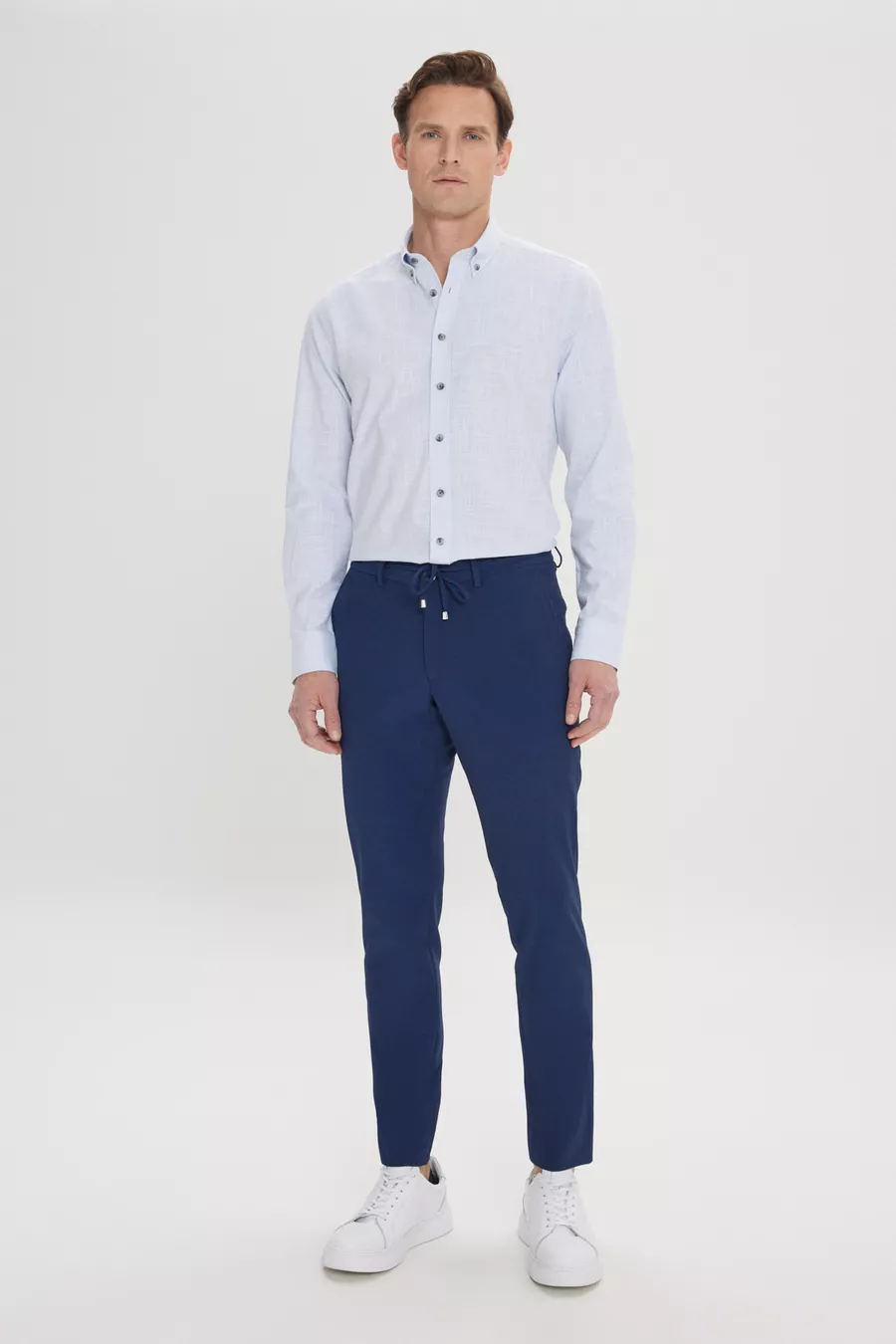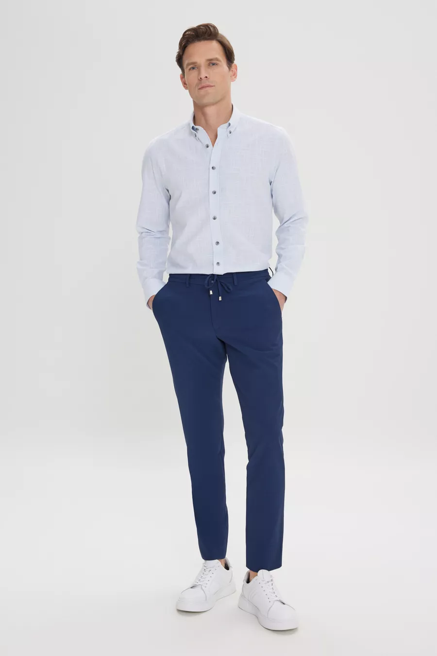 بنطال رجالي ضيق باللون الأزرق الداكن، قصّة نحيلة، مزود بحزام للخصر، وجيوب جانبية، بنقشة محززة