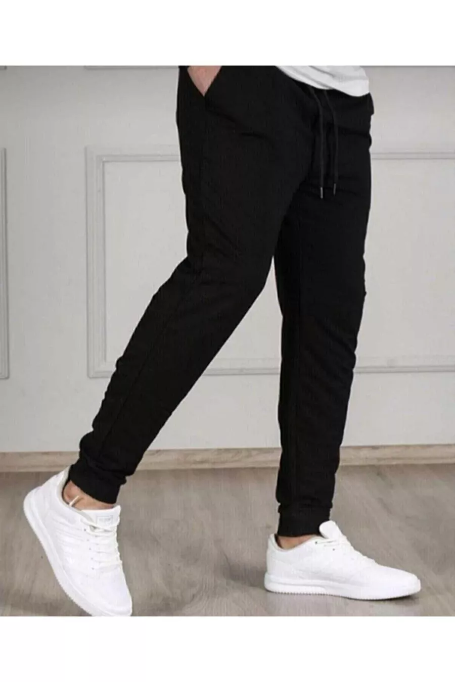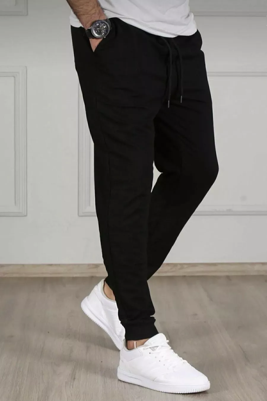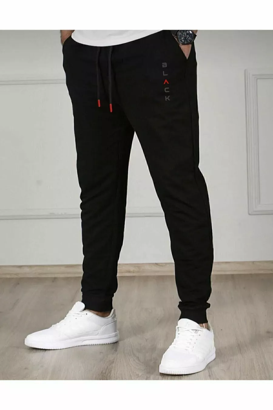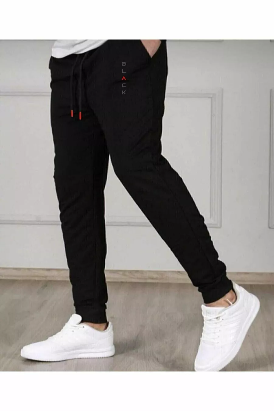بنطال رياضي رجالي أسود ضيق من القطن بقصة ساق ضيقة