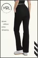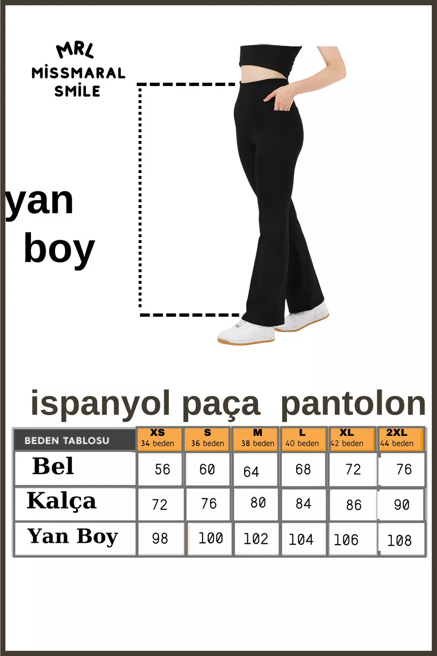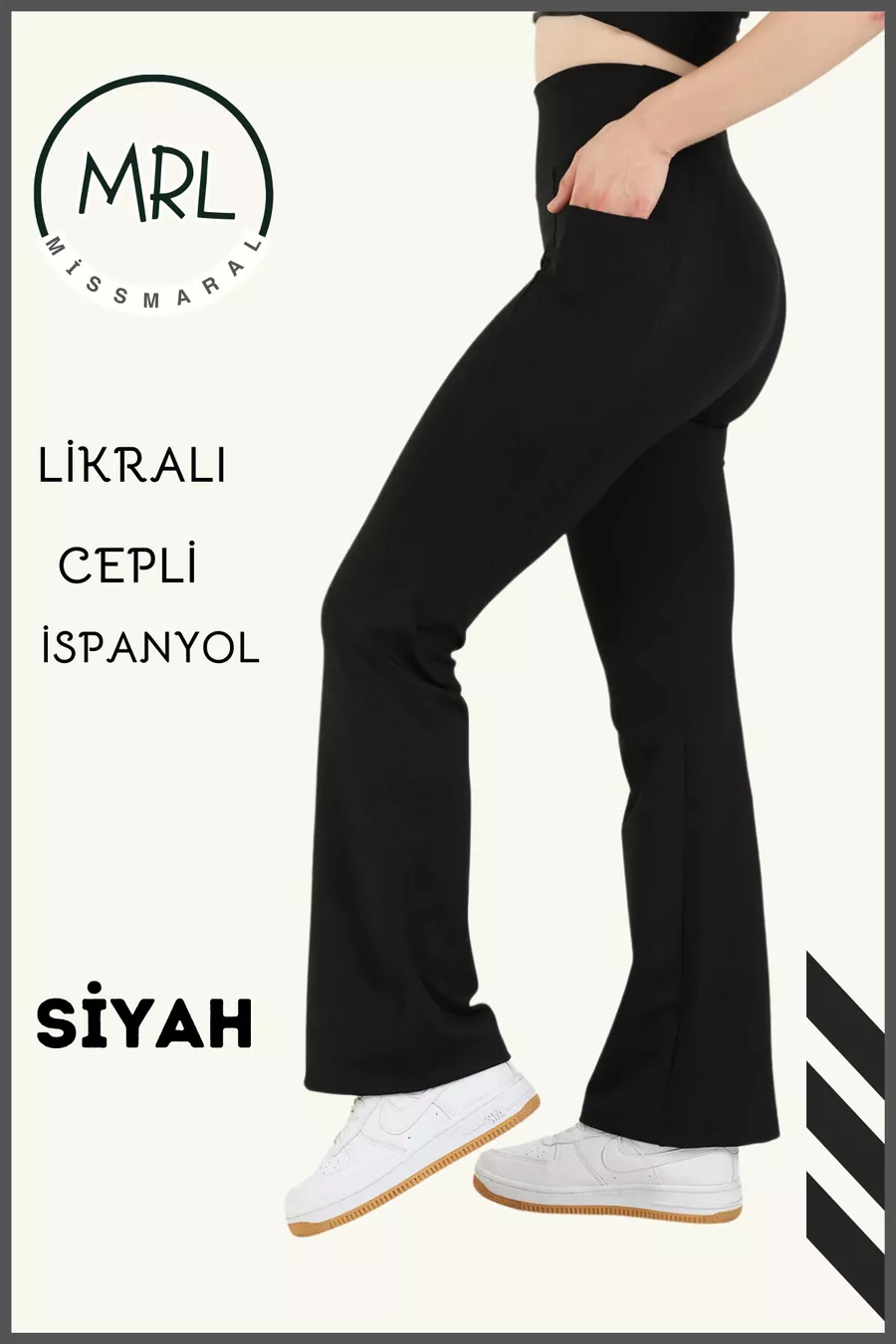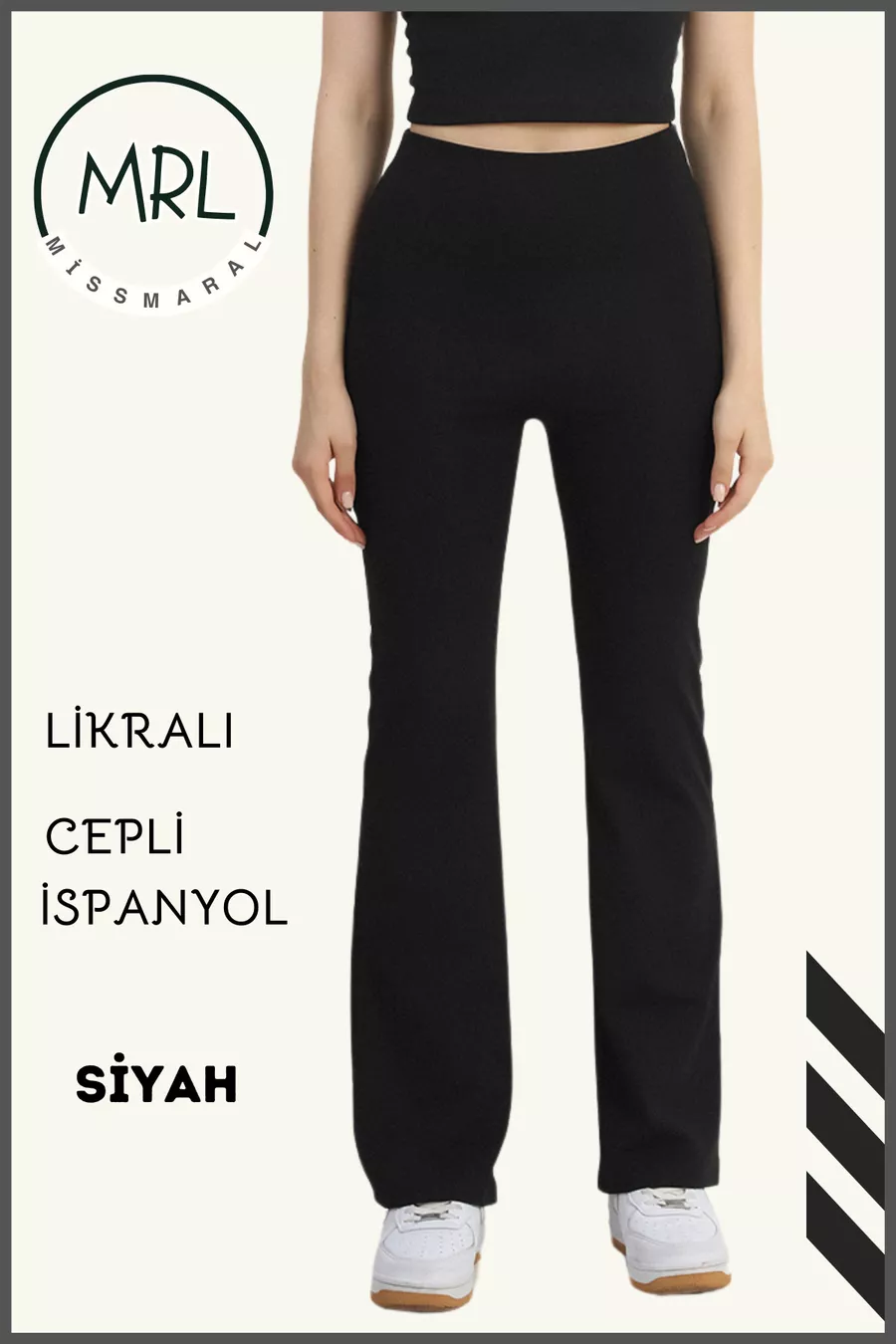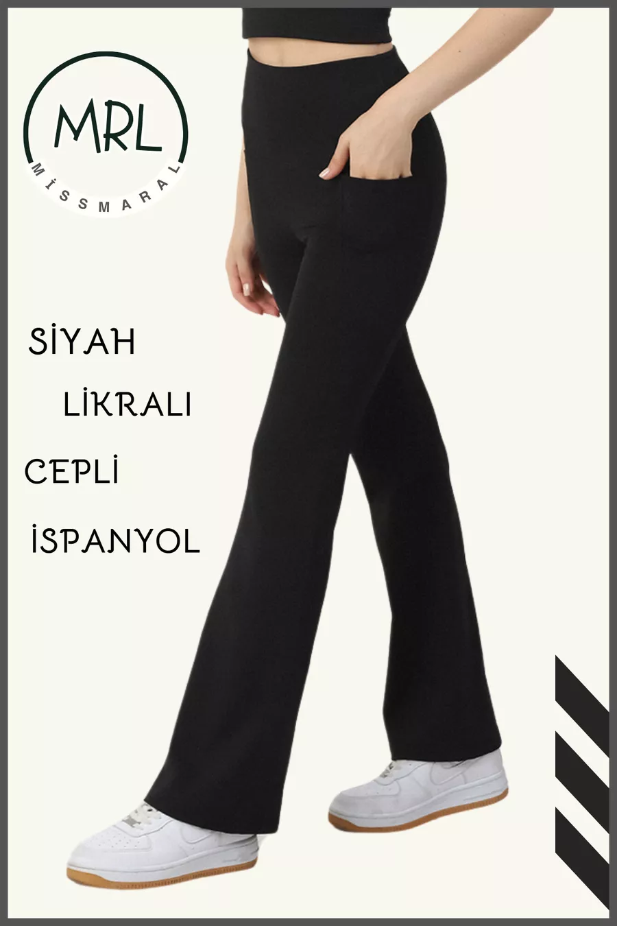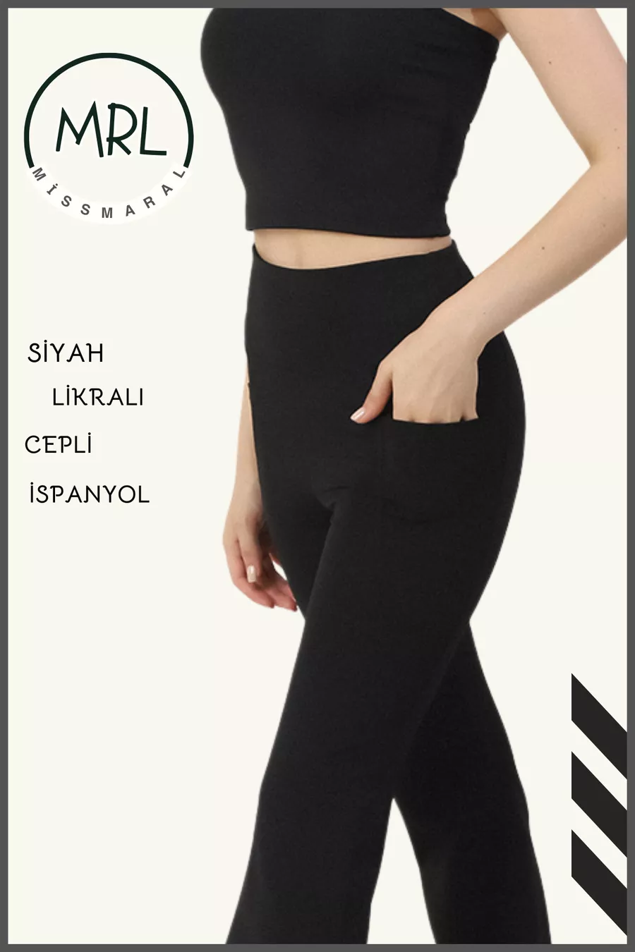 بنطال ضيق نسائي أسود بقصة إسبانية، خصر مرتفع، مشد، وجيوب مزدوجة، بوت كت