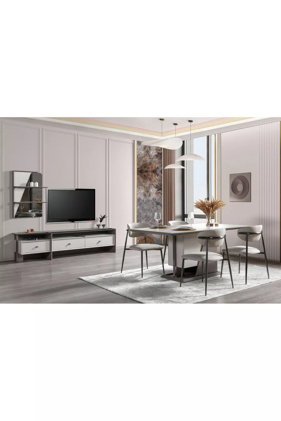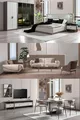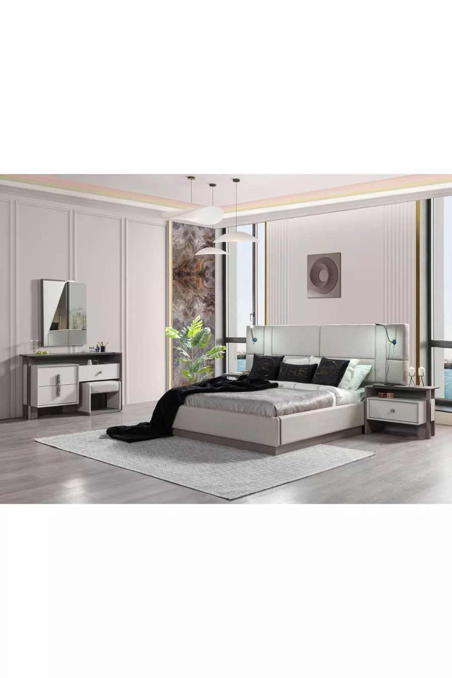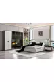 محتوى المجموعة: سرير بقاعدة + 2 كرسي جانبي + خزانة أدراج + خزانة