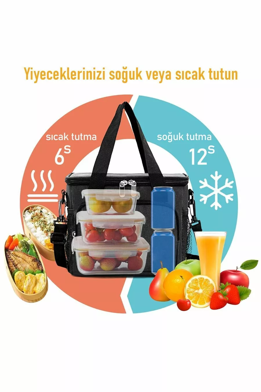 حقيبة حرارية سوداء، حقيبة طعام تحافظ على البرودة والحرارة، حقيبة طعام مبردة مع ثلّاجة L - سوداء