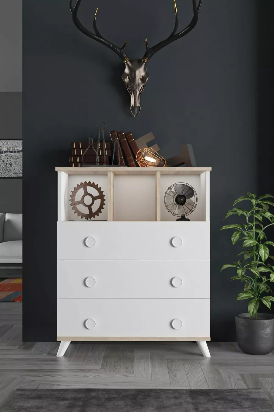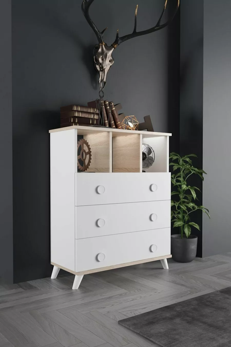 اللون: أبيض مدة الضمان: سنتان المادة: سانتالام الارتفاع: 102 سم العرض: 81 سم العمق: 38 سم عدد الأدراج: 3 ميزة المنتج: مع رفوف الأسلوب: إسكندنافي الموضوع / الأسلوب: إسكندنافي بلد المنشأ: تركيا الميزة: مع أدراج