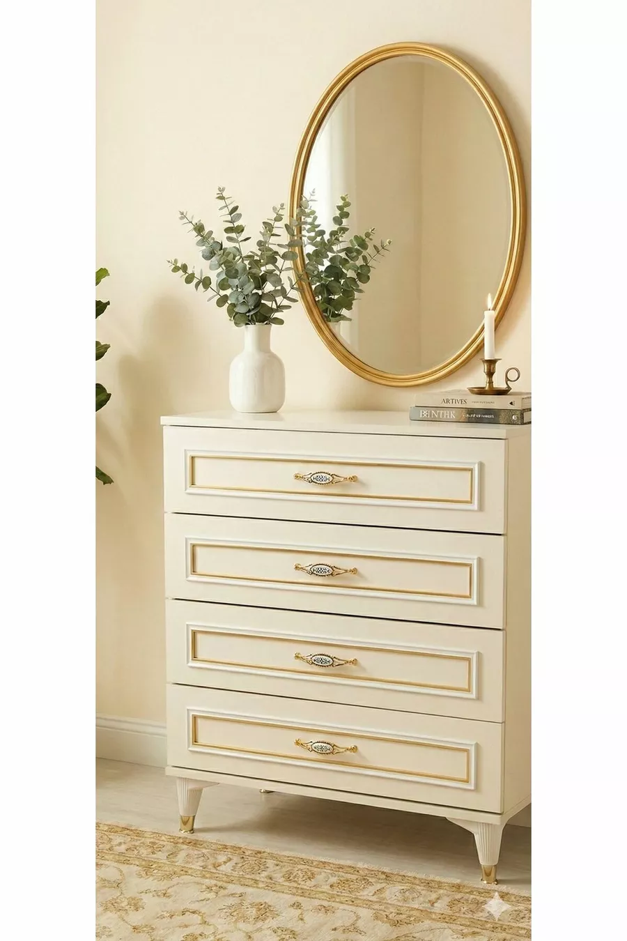 اللون: ذهبي المادة: سندالوم الارتفاع: 80 سم العرض: 70 سم العمق: 40 سم عدد الأدراج: 4 ميزة المنتج: يحتوي على أدراج الثيم / النمط: حديث المنشأ: تركيا