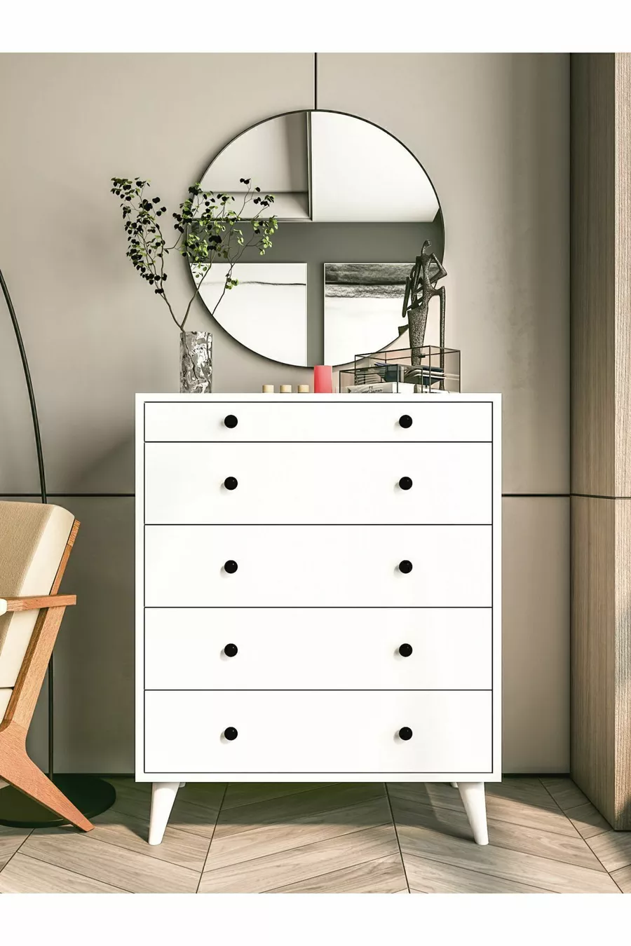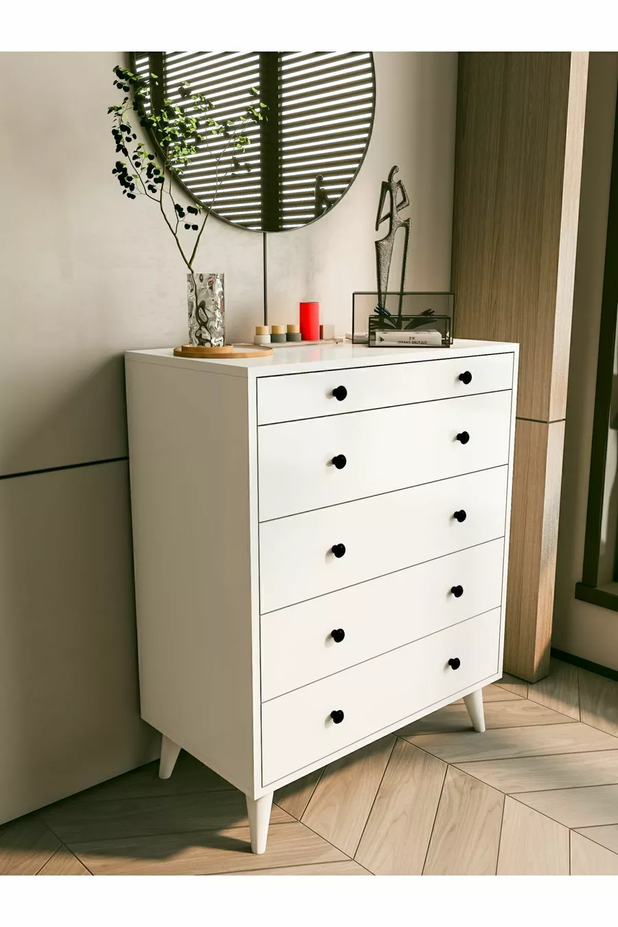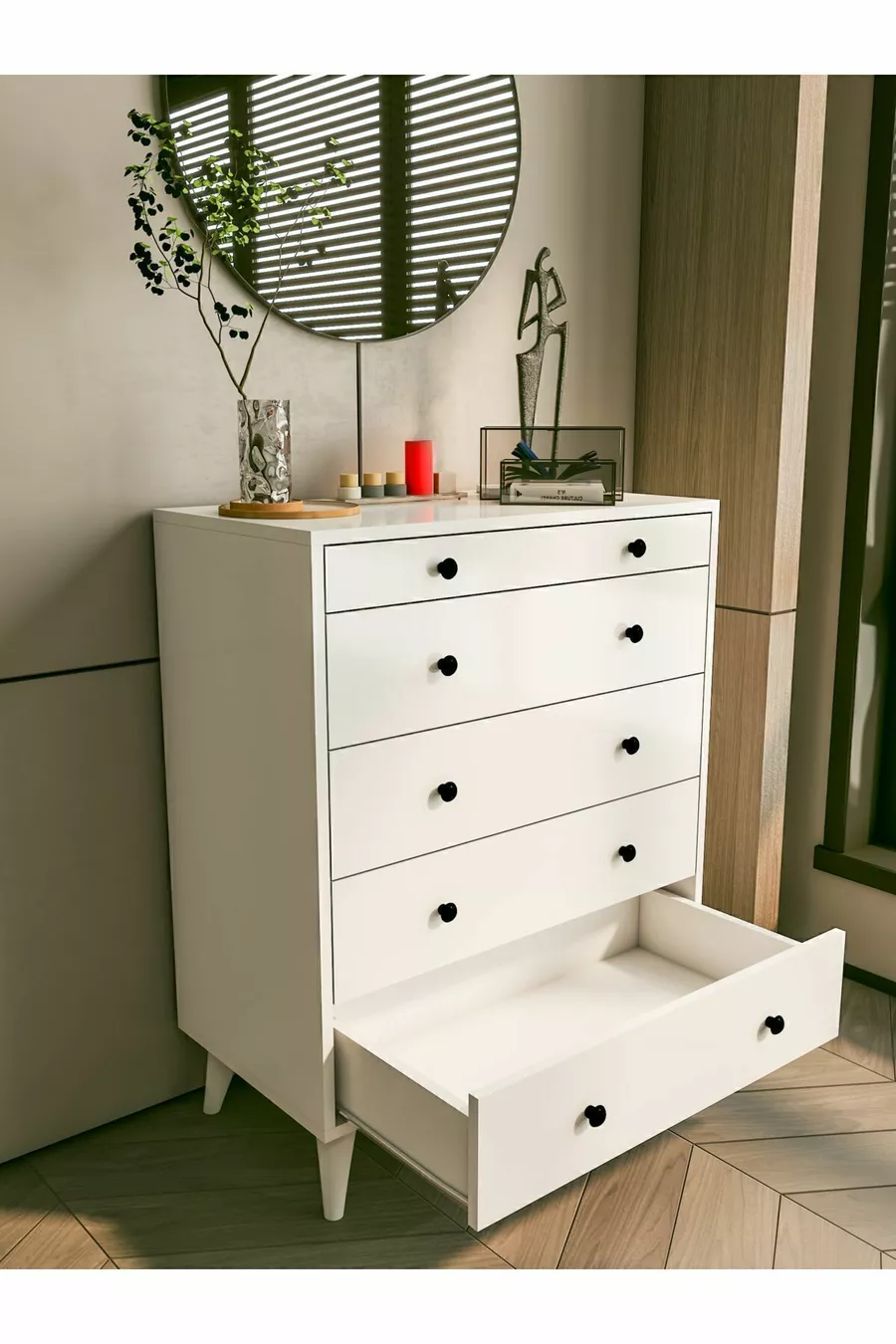 اللون: أبيض مدة الضمان: سنة واحدة المادة: سونتالام الارتفاع: 100 سم العرض: 80 سم العمق: 43 سم عدد الأدراج: 5 ميزة المنتج: يحتوي على أدراج النمط: إسكندنافي الموضوع / النمط: إسكندنافي بلد المنشأ: تركيا الميزة: تهوية