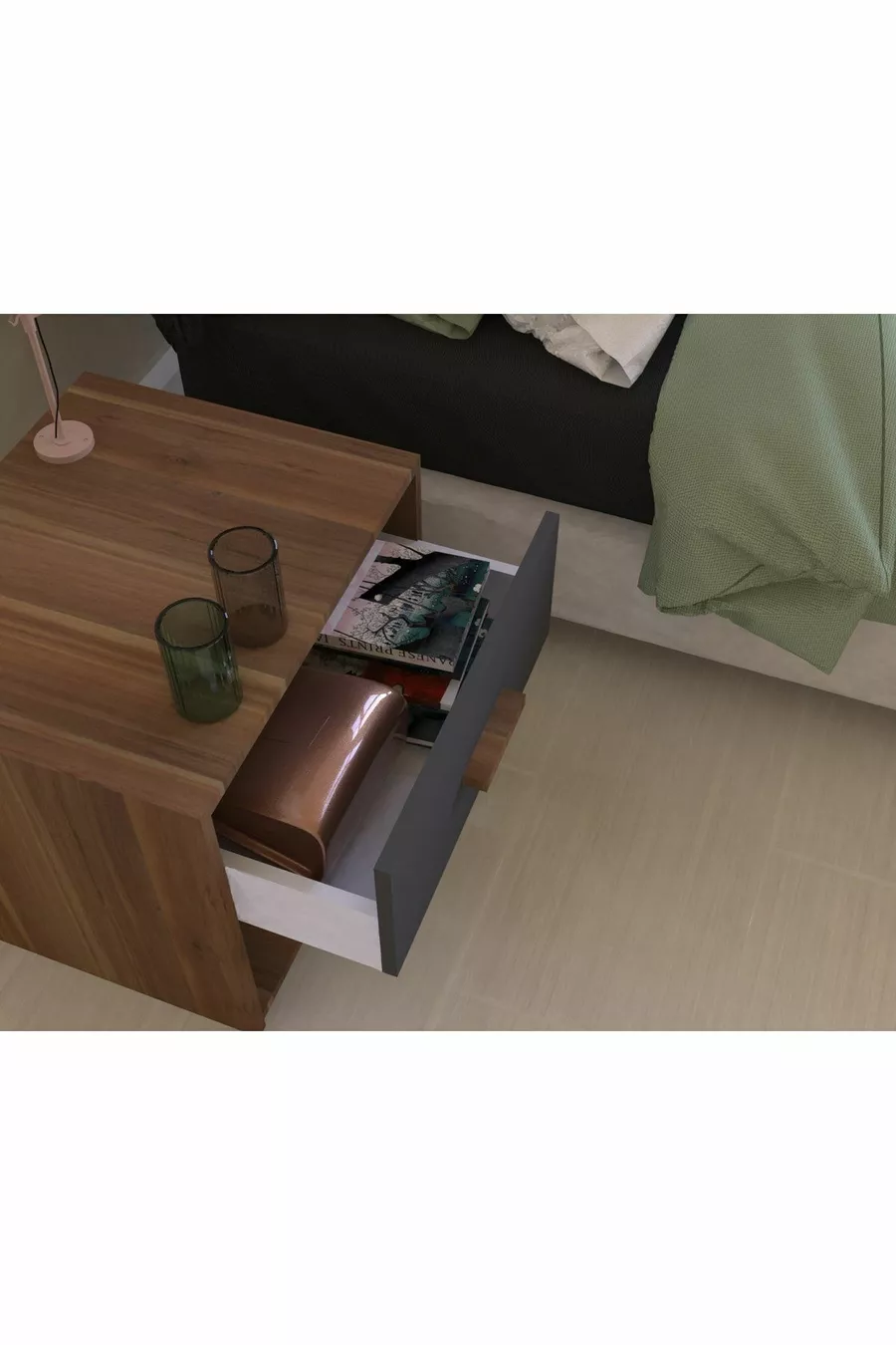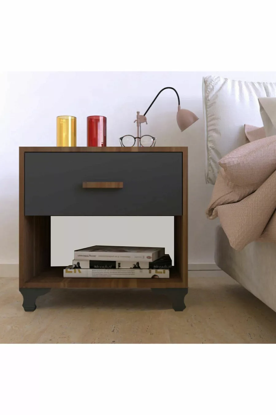 خزانة جانبية بدرج واحد بلون الجوز والفحم الرمادي