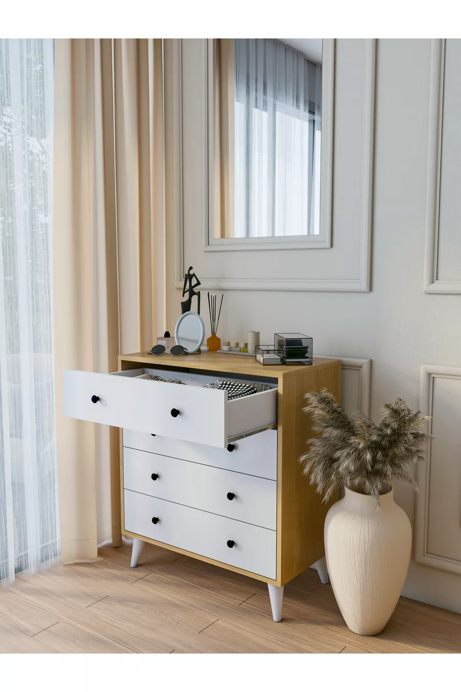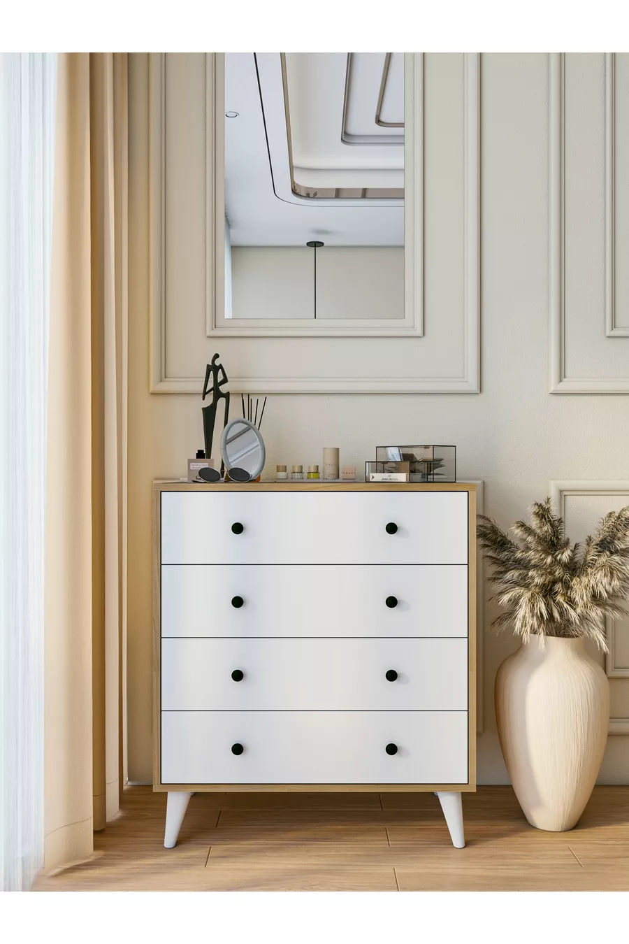 اللون: أبيض مدة الضمان: سنتان المادة: سونتالام الارتفاع: 91 سم العرض: 80 سم العمق: 43 سم عدد الأدراج: 4 ميزة المنتج: يحتوي على أدراج النمط: إسكندنافي الموضوع / النمط: إسكندنافي بلد المنشأ: تركيا الميزة: تهوية