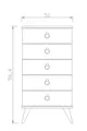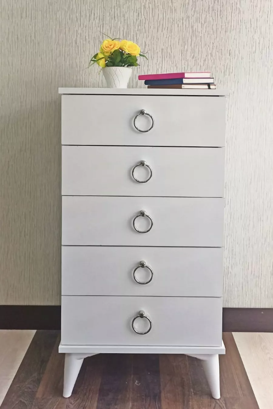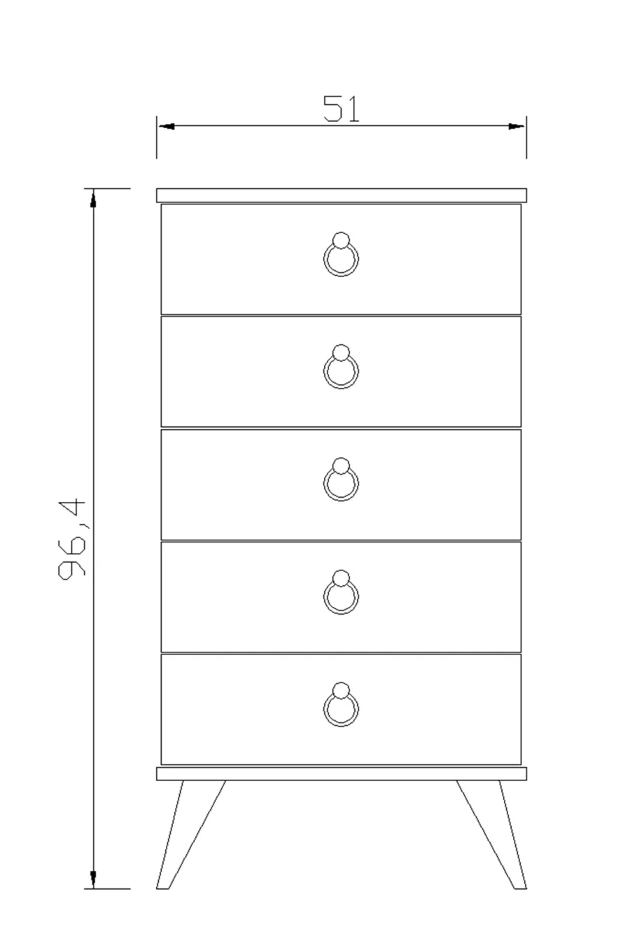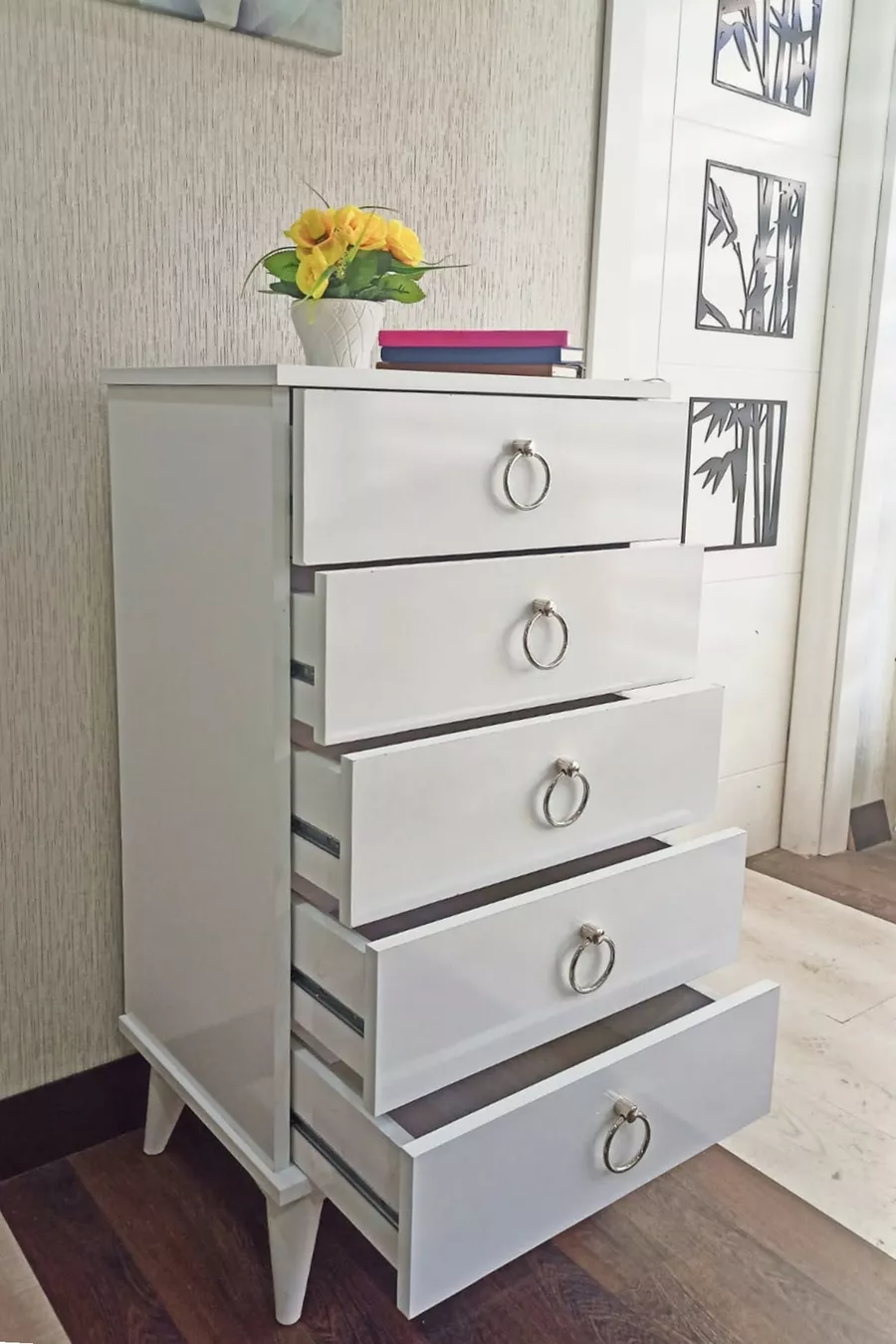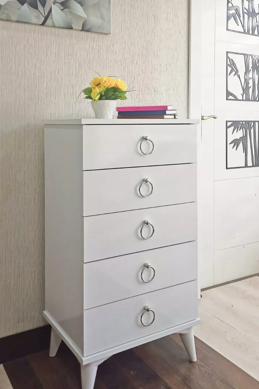 اللون: أبيض المادة: خشب صناعي الارتفاع: 96 سم العرض: 51 سم العمق: 40 سم عدد الأدراج: 5 خاصية المنتج: يحتوي على أدراج الأسلوب: ريترو الموضوع / الأسلوب: ريترو الميزة: يحتوي على أدراج