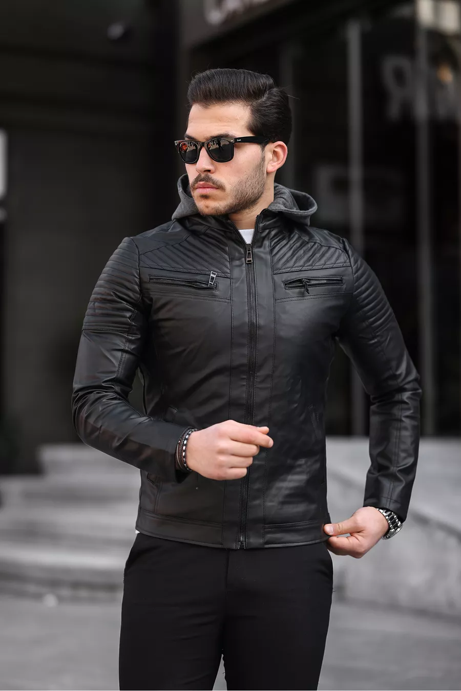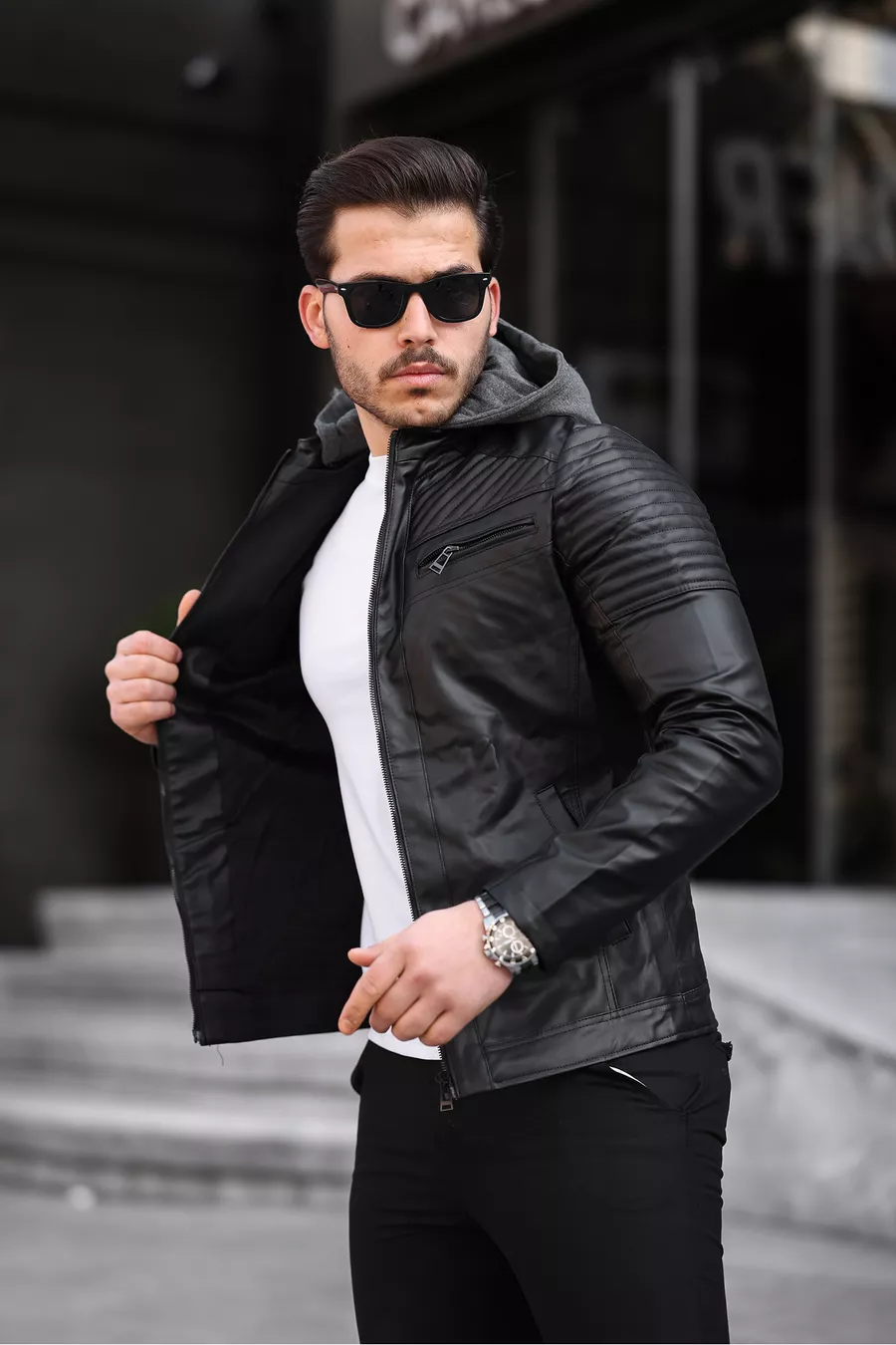 سترة جلدية رجالية سوداء من بريفالدي مع قبعة قابلة للإزالة