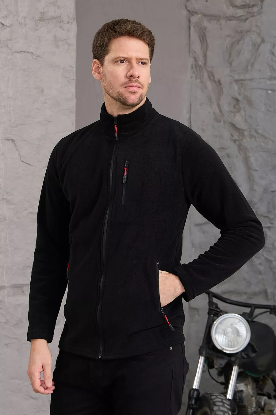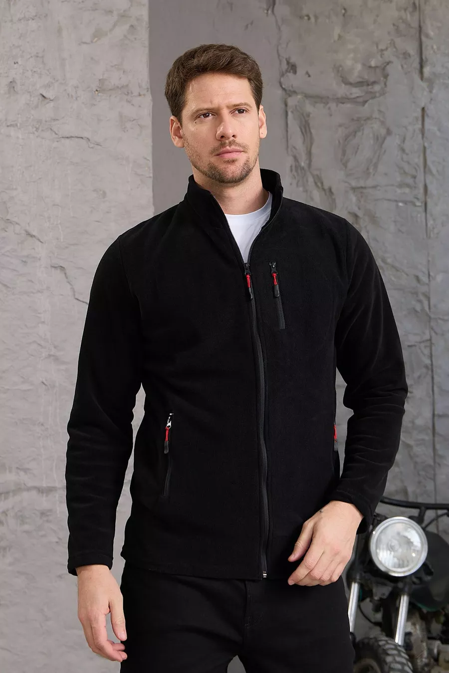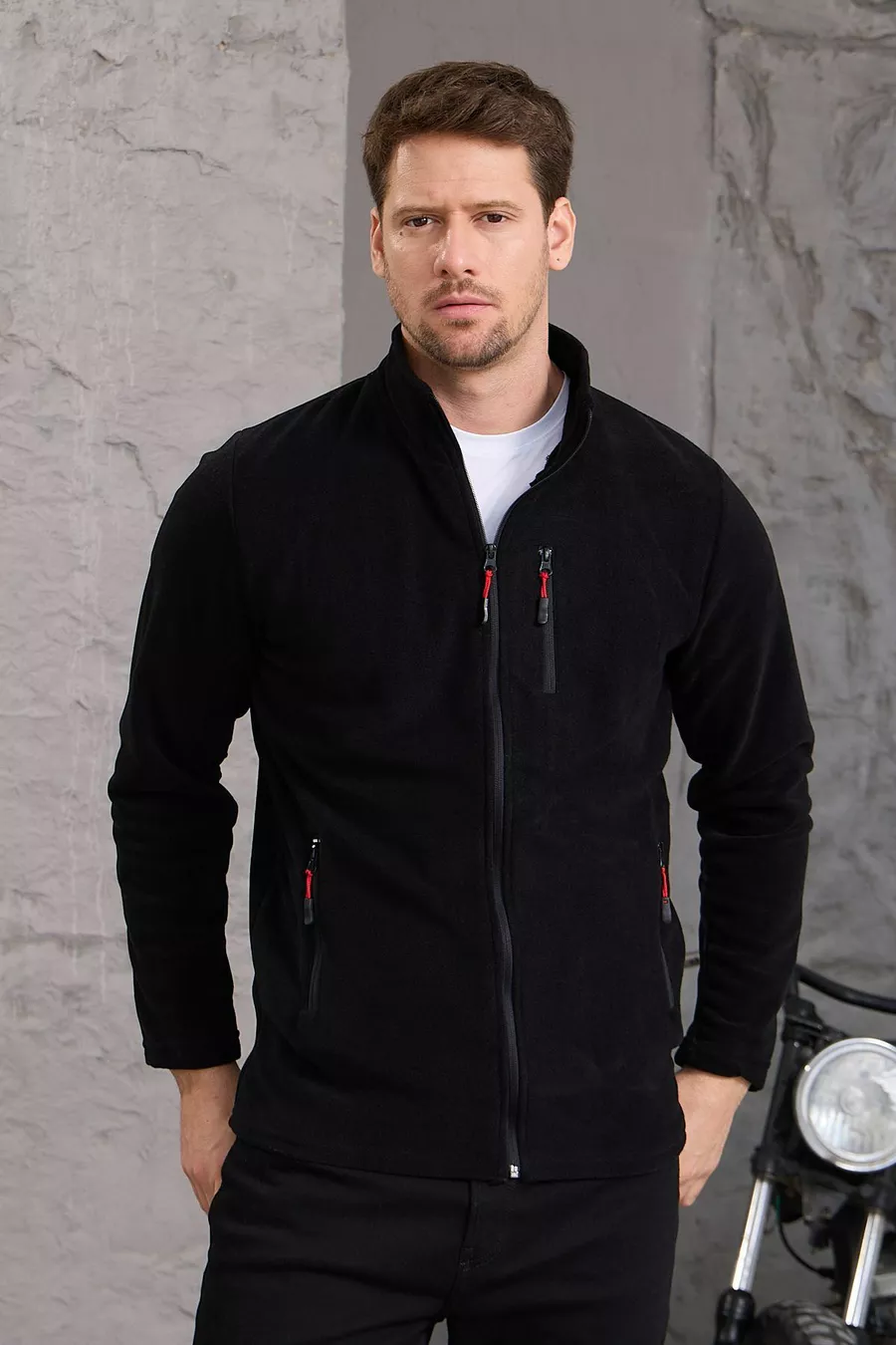سترة رجالية شتوية بسحاب كامل من القماش القطني السميك بولار باللون الأسود