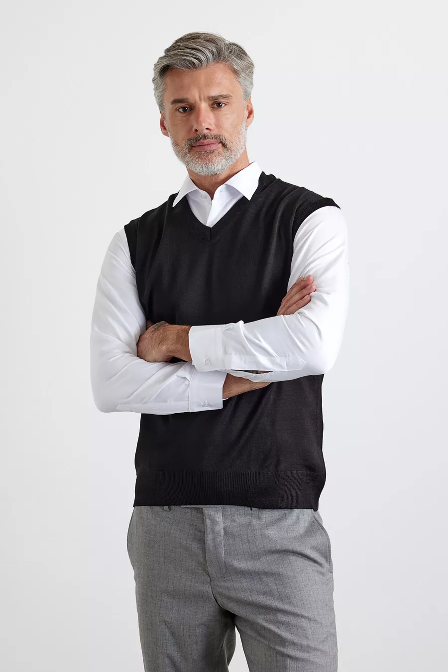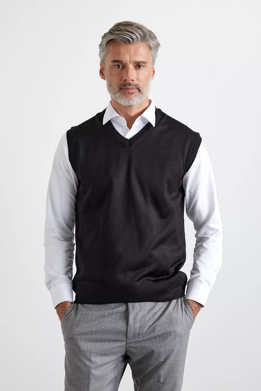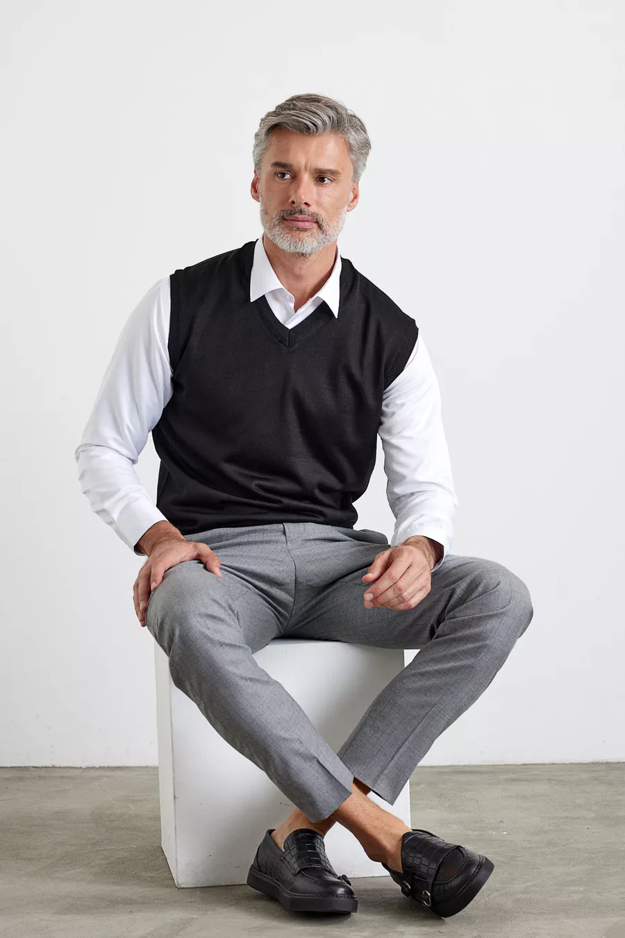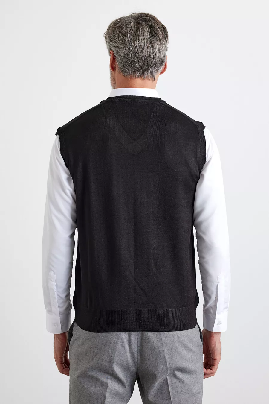 سترة رجالية بدون أكمام بياقة V، مقاس عادي، تصميم قياسي، كنزة صوفية