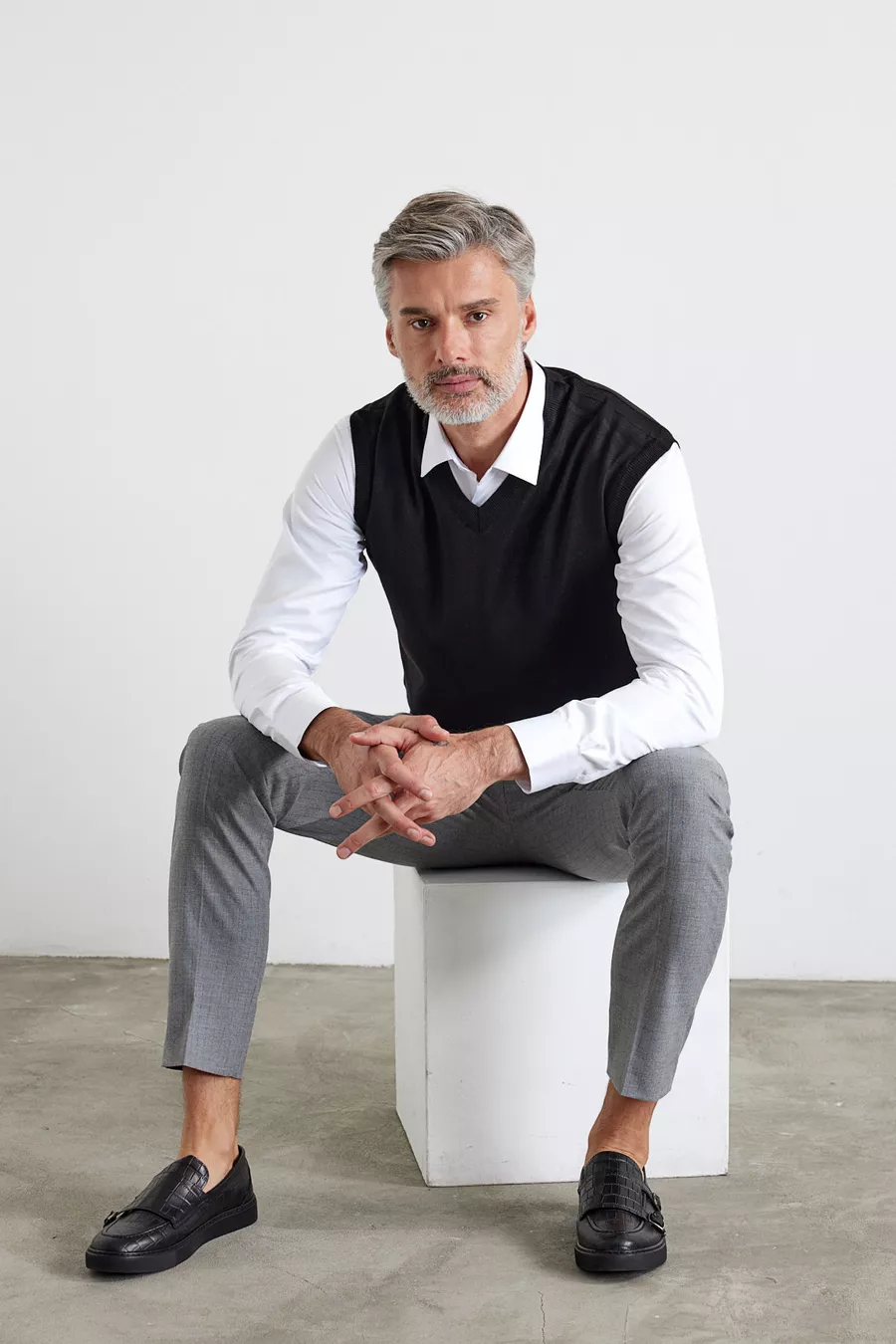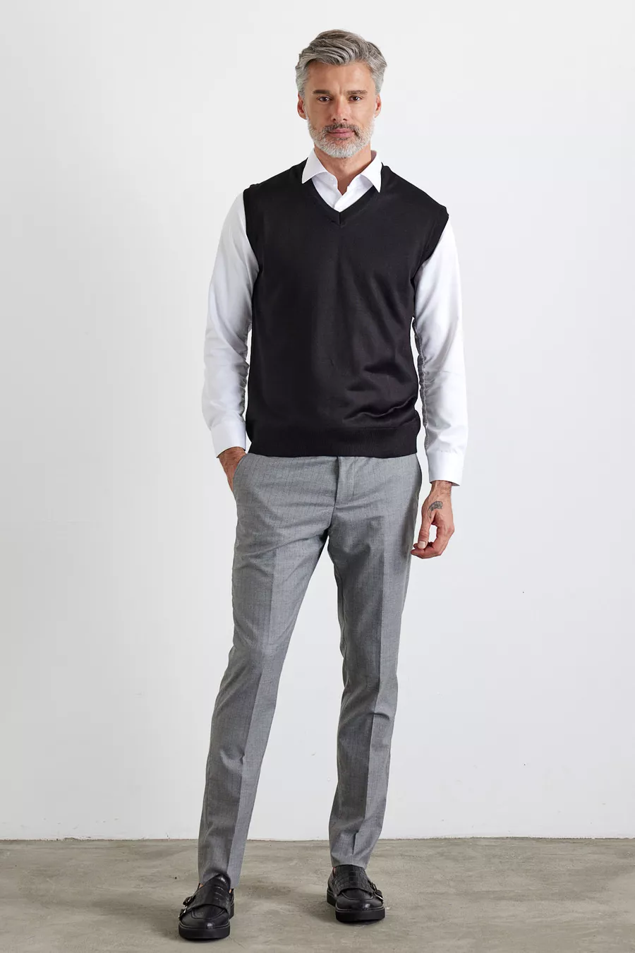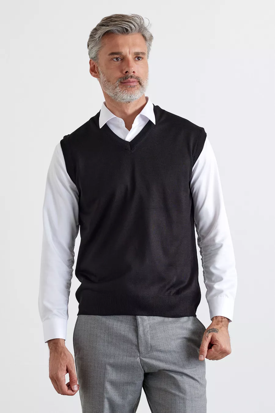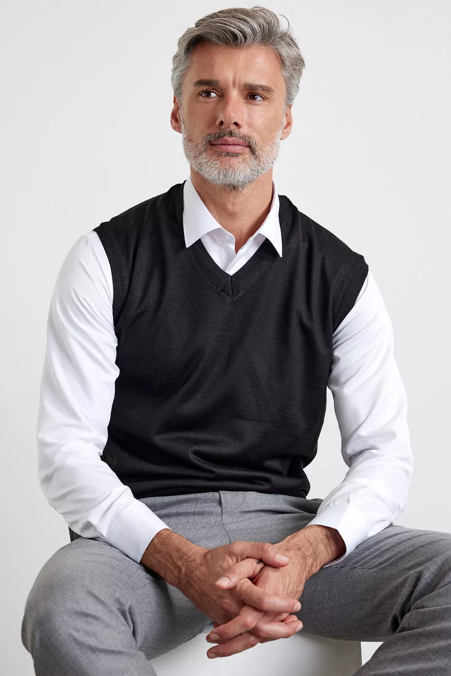 سترة رجالية بدون أكمام بياقة V، مقاس عادي، تصميم قياسي، كنزة صوفية