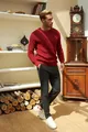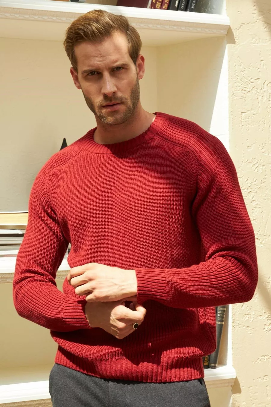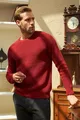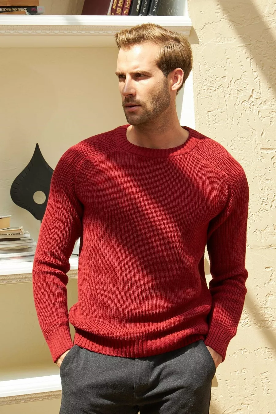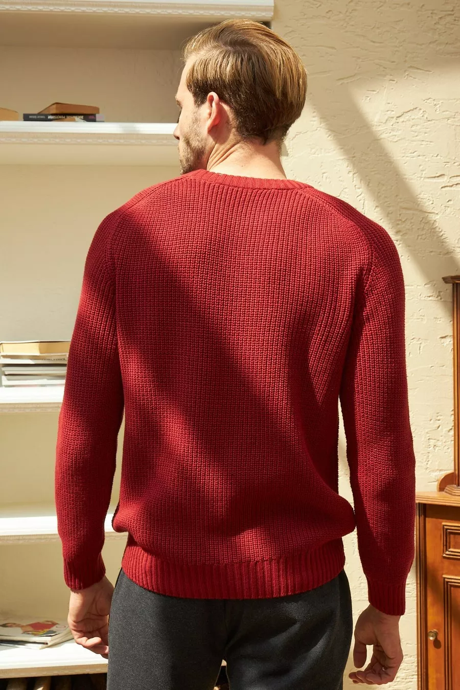 سترة صوفية رجالية من القطن بلون عنابي برقبة عالية وتريكو سبور