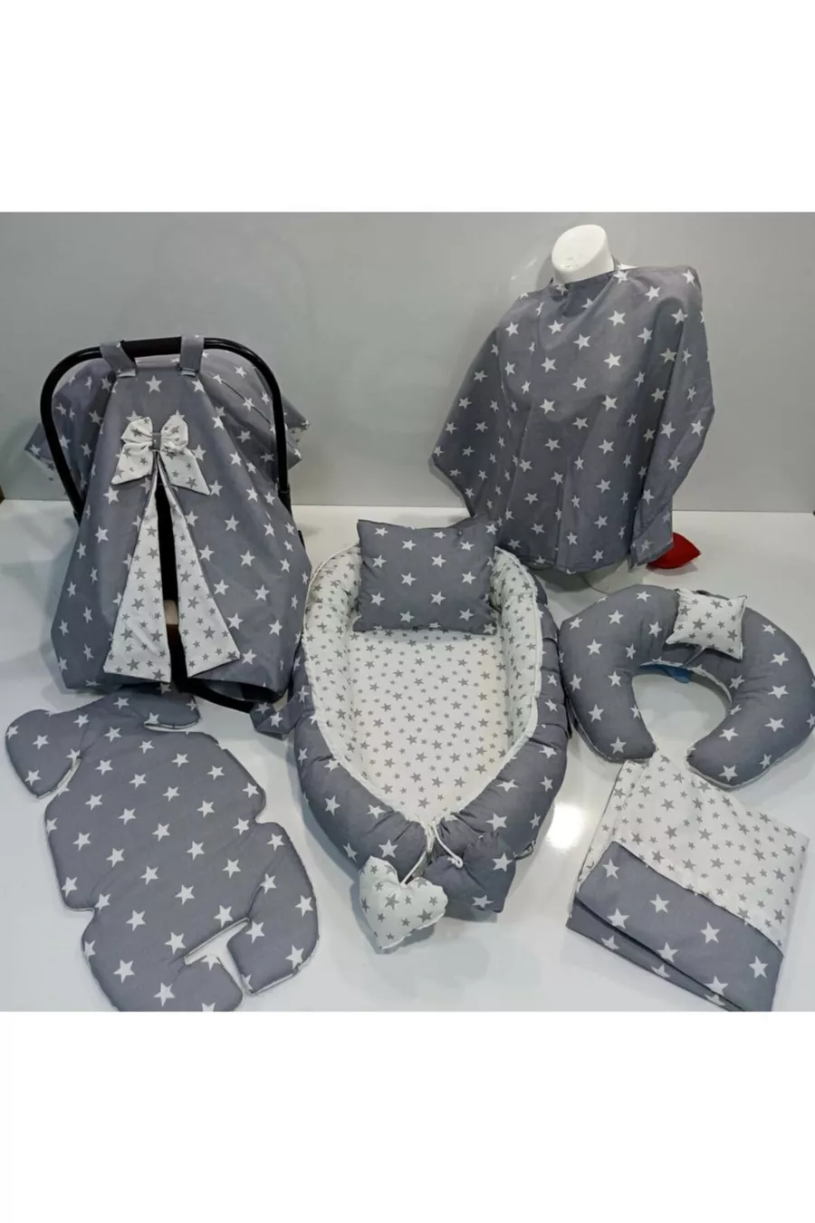 سرير أطفال بيضاوي على شكل منزل حديث الولادة من 7 قطع باللون الرمادي والأبيض