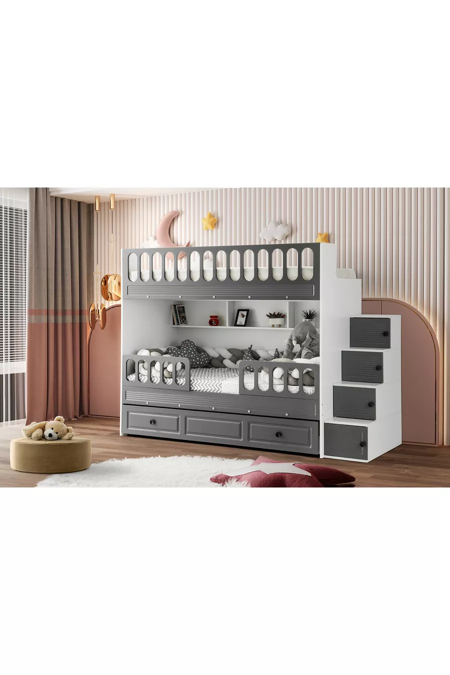 سرير بطابقين مع ستائر / يشمل مرتبتين مرنتين من البامبو / التركيب مجاني
