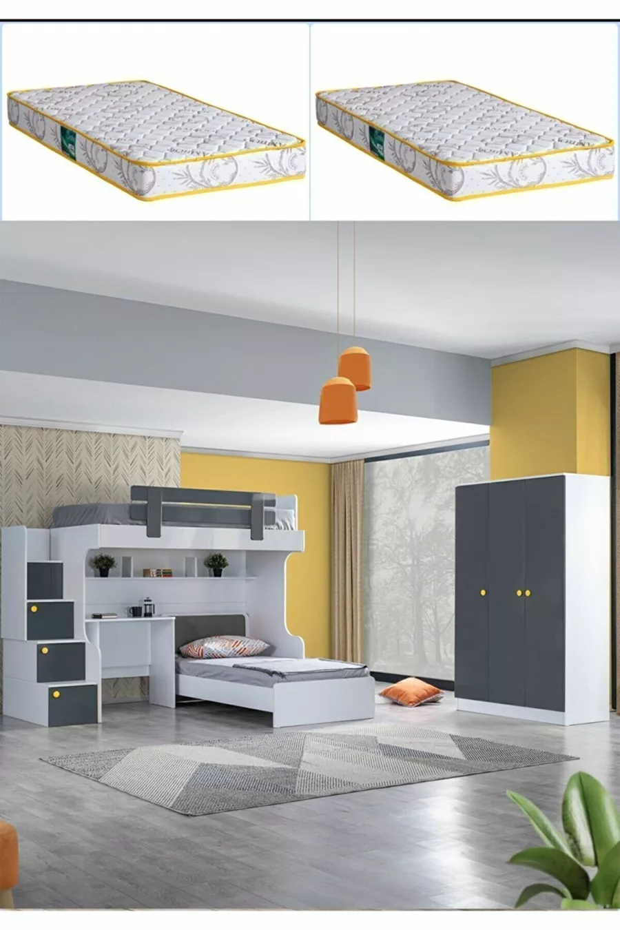 سرير بطابقين، سرير وطاولة وخزانة بثلاثة أبواب مع مرتبتين مريحتين