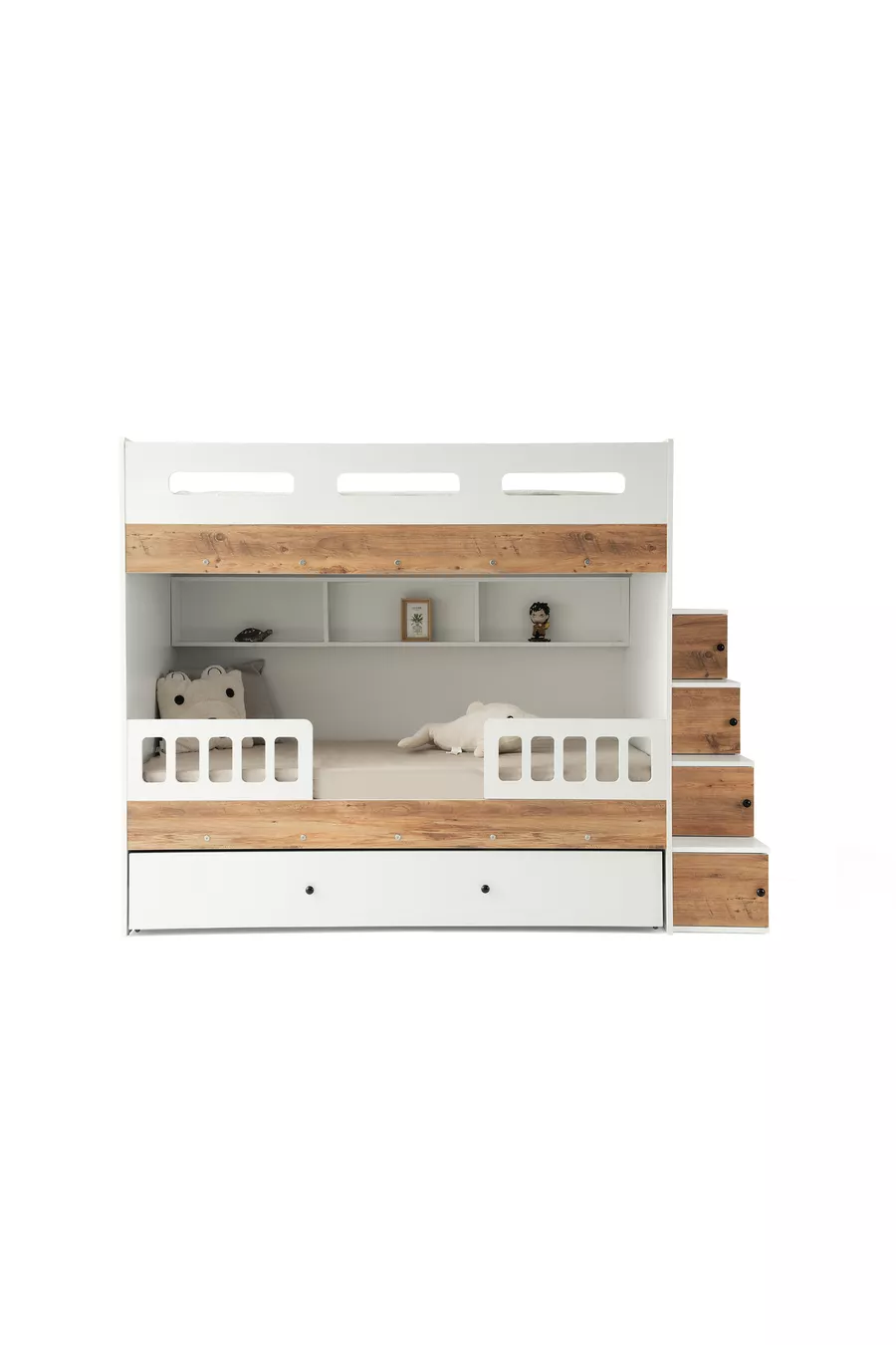 سرير بطابقين برلين / أبيض-صنوبر / 3 أقسام للنوم وسلم مع خزانة / MDF بنسبة %