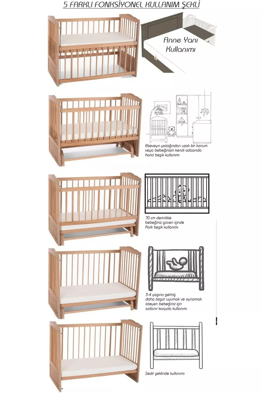 المادة: خشب اللون: بني سعة التحميل: 9 - 25 كغ مدة الضمان: سنتان الوظيفة: متأرجح نوع الاستخدام: بجانب الأم وظيفة التأرجح: موجودة العرض: 125 سم مقاس السرير الداخلي: 60 × 120 العمق: 65 سم الارتفاع: 100 سم الموضوع / النمط: اسكندنافي المنشأ: تركيا الميزة: ليلي