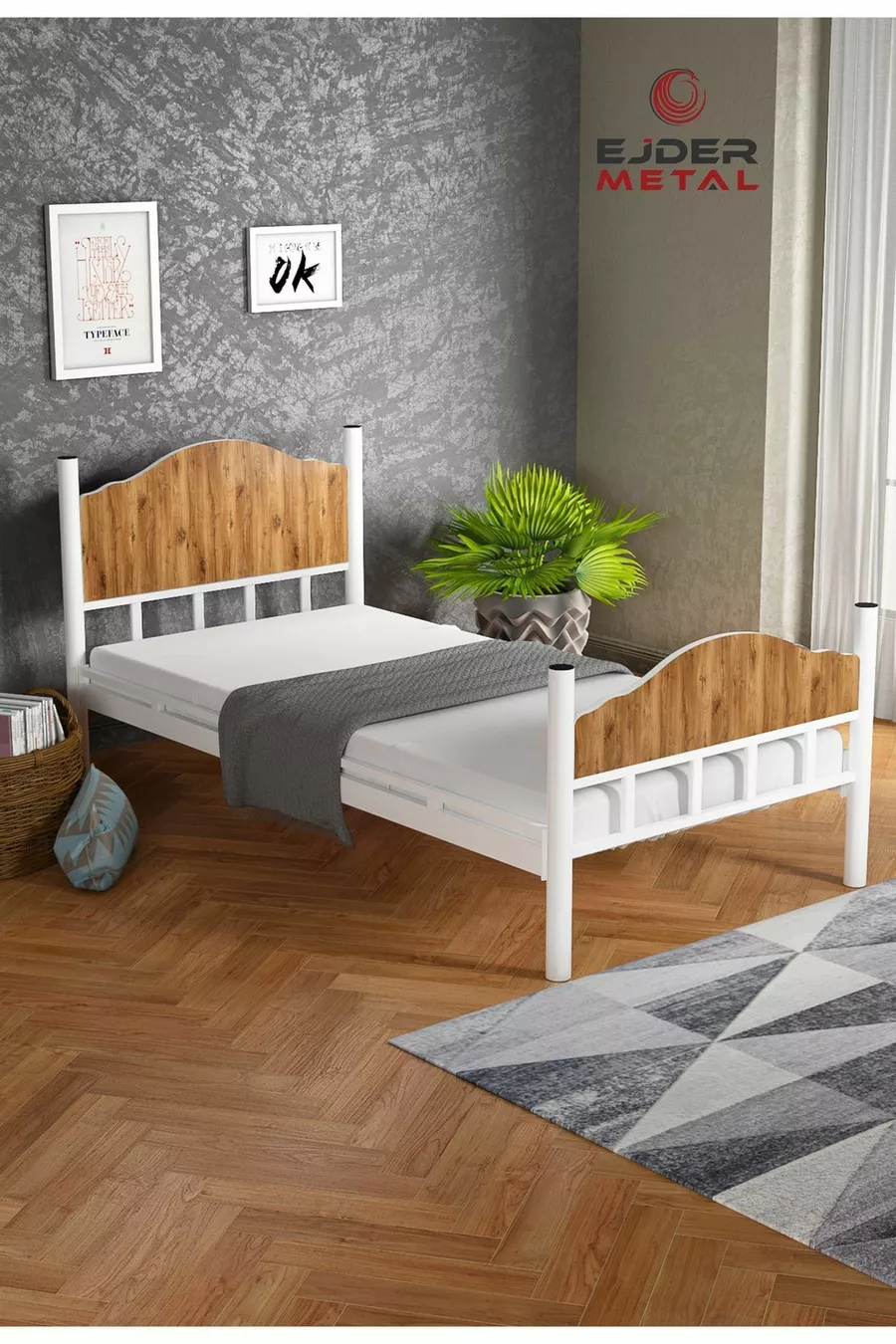 سرير معدني بسطح خشبي مفرد باللون الجوز (بدون مرتبة)
