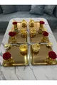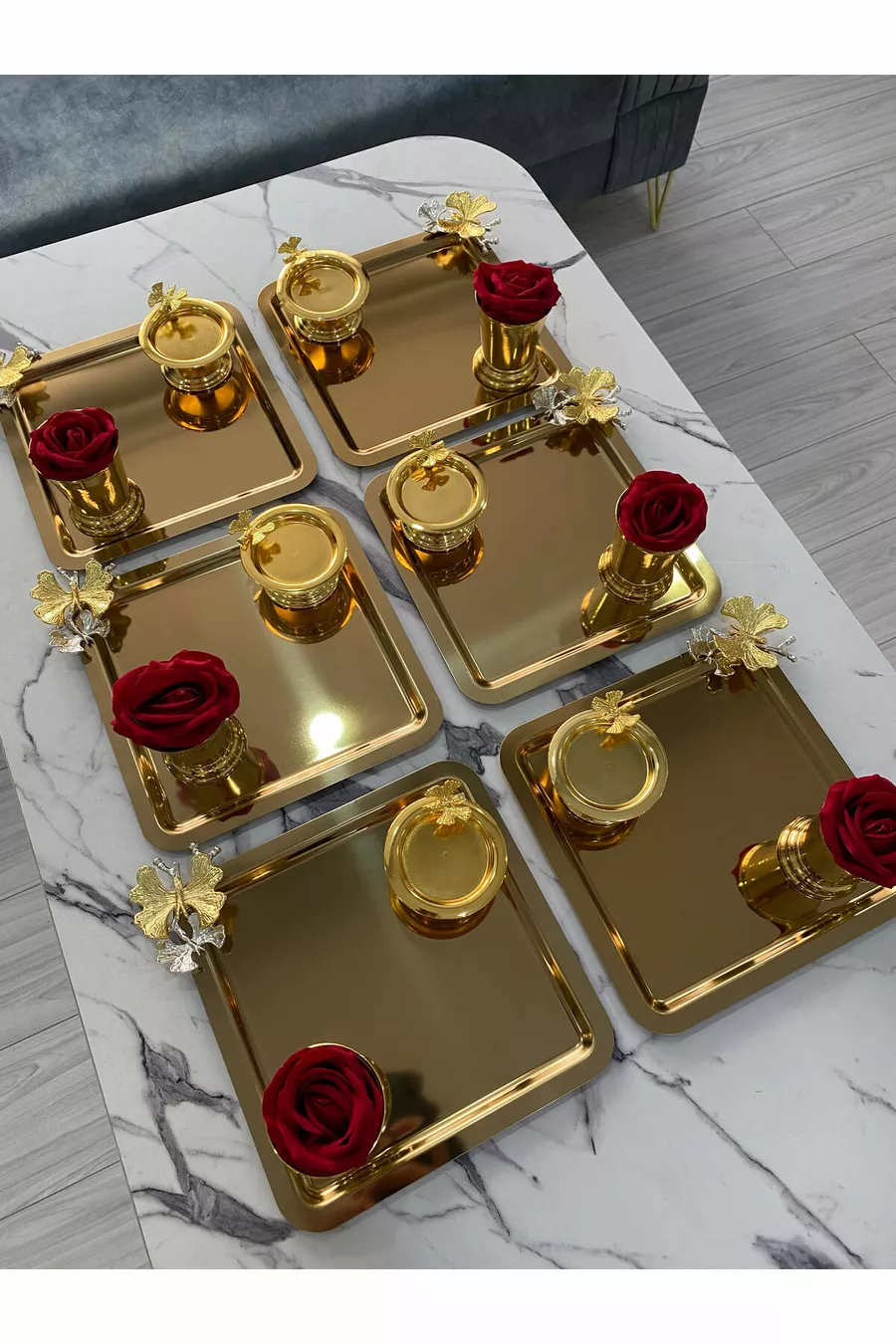 صينية تقديم مربعة من الفولاذ المذهّب 6 قطع بثلاثة موديلات مختلفة، دلو ذهبي للورود (بوردات وردية)، حامل معكرون بفراشات