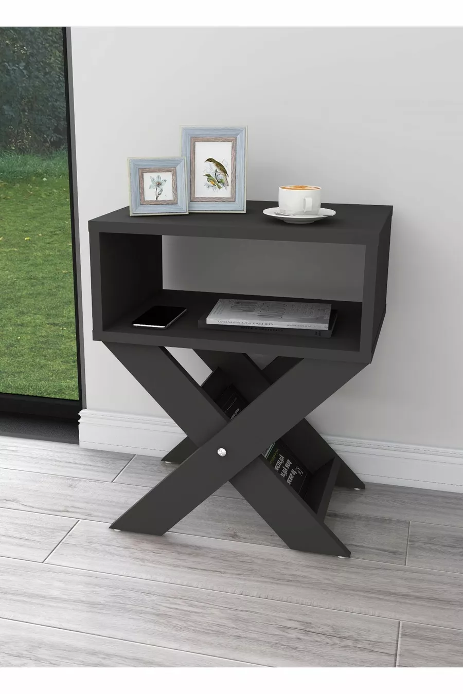 طاولة بجانب السرير مع رف للجريدة وقاعدة على شكل X