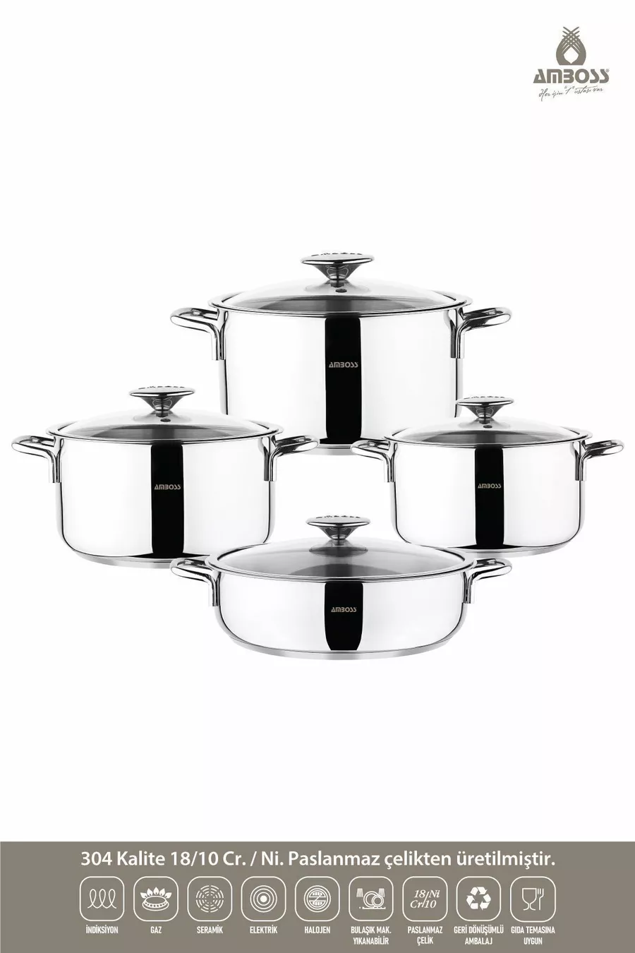 طقم أواني طهي من الفولاذ المقاوم للصدأ المكون من 8 قطع من Cool، مع أغطية زجاجية وقاعدة للحث