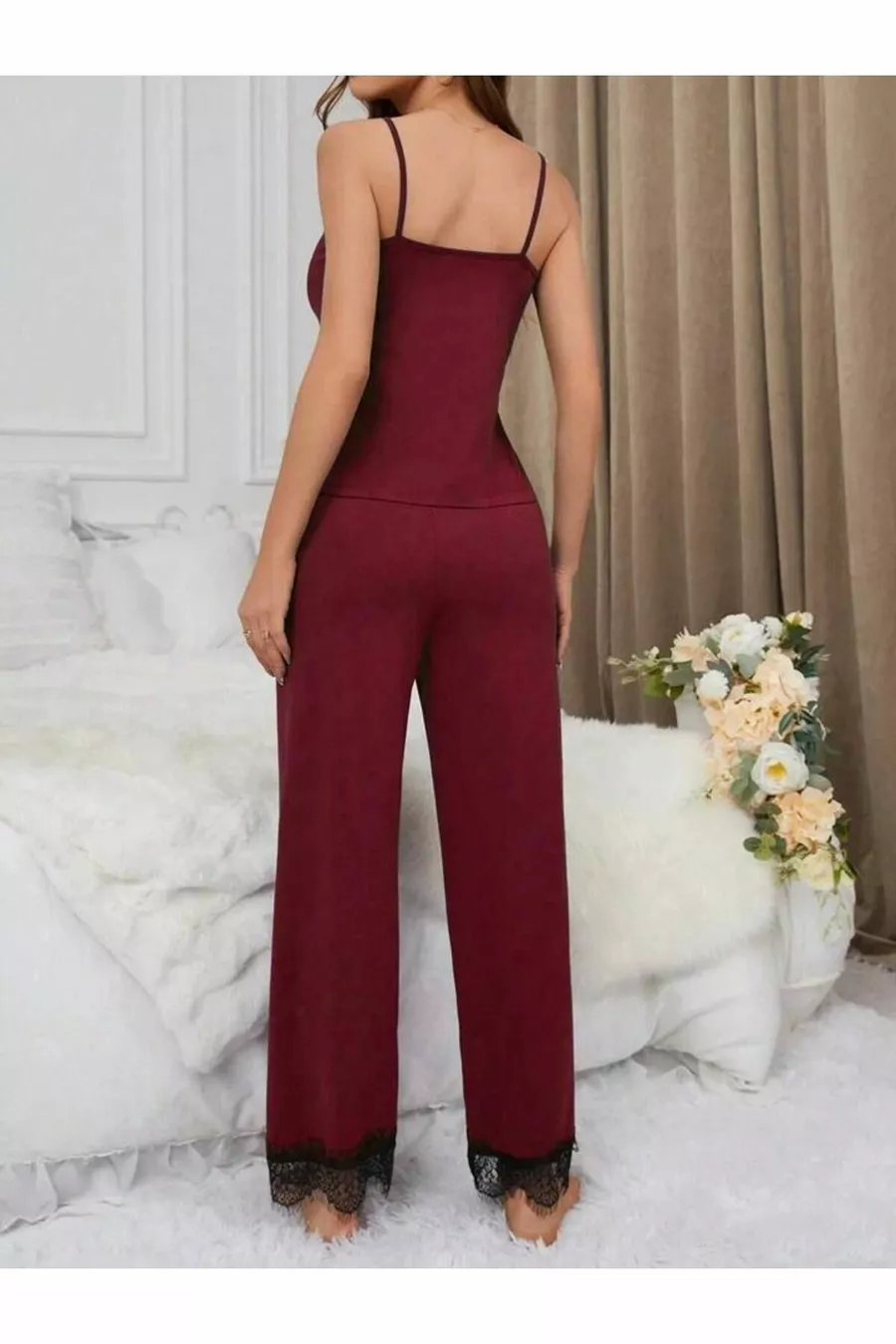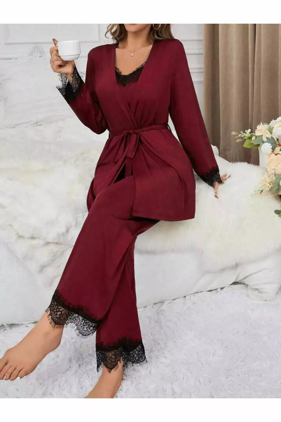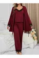 طقم بيجامة نسائي بورجوندي مع رداء صبح مع تفاصيل دانتيل وقطن فيسكون ثلاث قطع