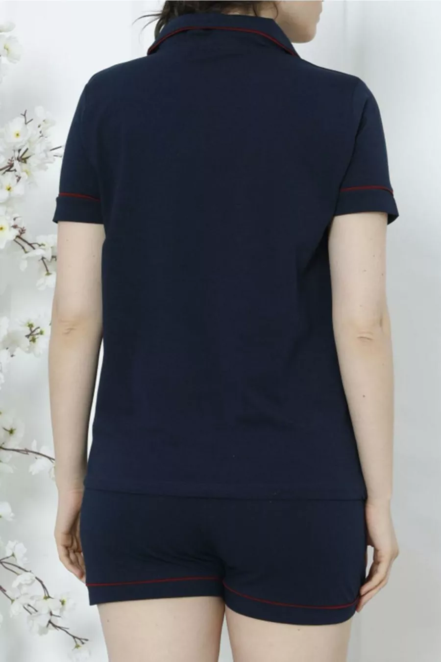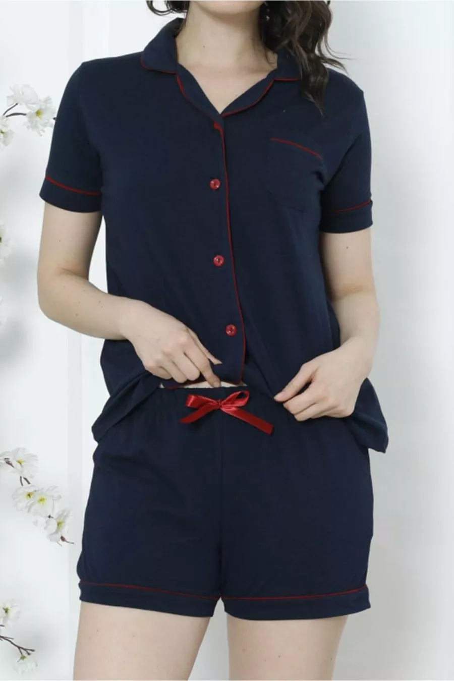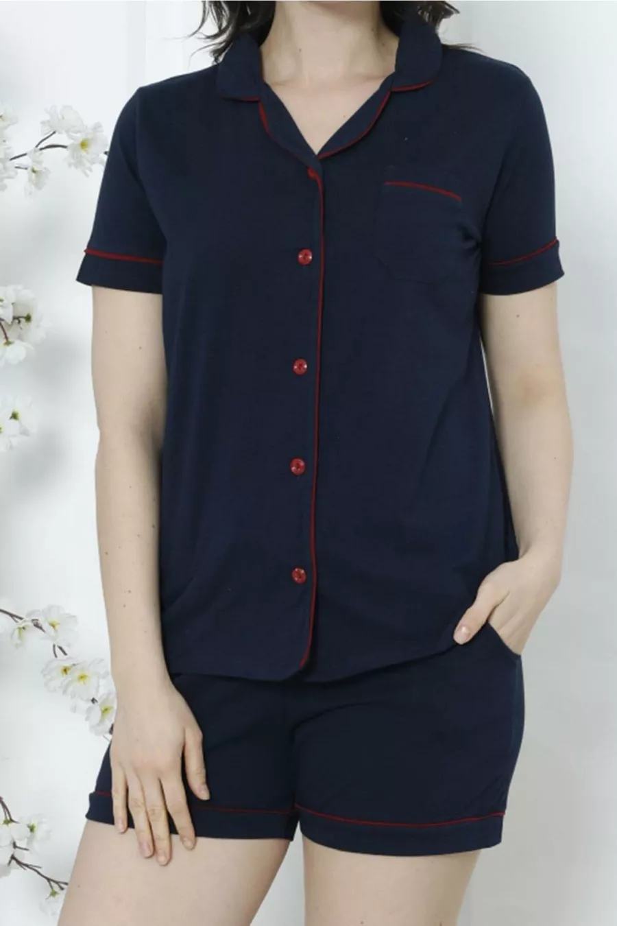 طقم بيجامة نسائي بالشورت بأكمام قصيرة مع أزرار وجيوب، قطن، أزرق داكن-أحمر خمري