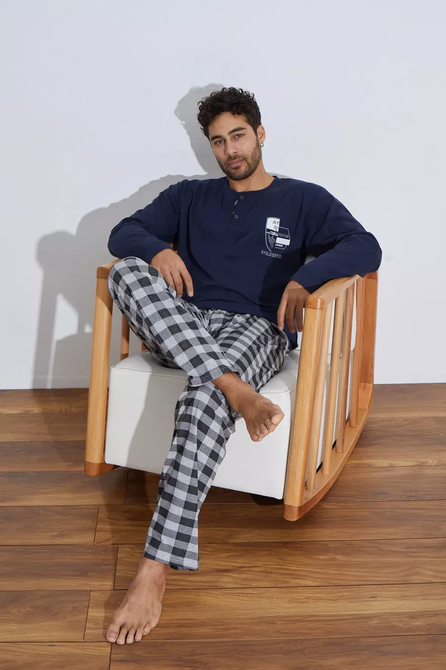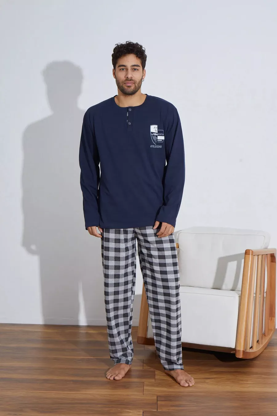 طقم بيجامة رجالي بأكمام طويلة من القطن الفاخر (رفيع) مع مربعات