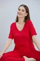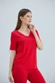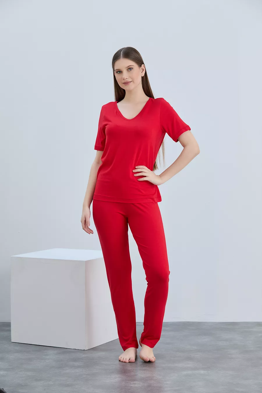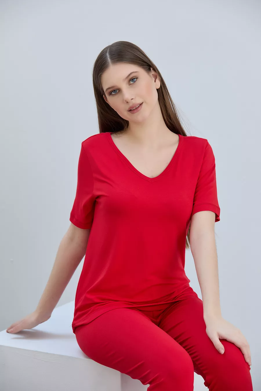 طقم بيجامة نسائي منسوج من الفيسكوز برقبة V وأكمام قصيرة