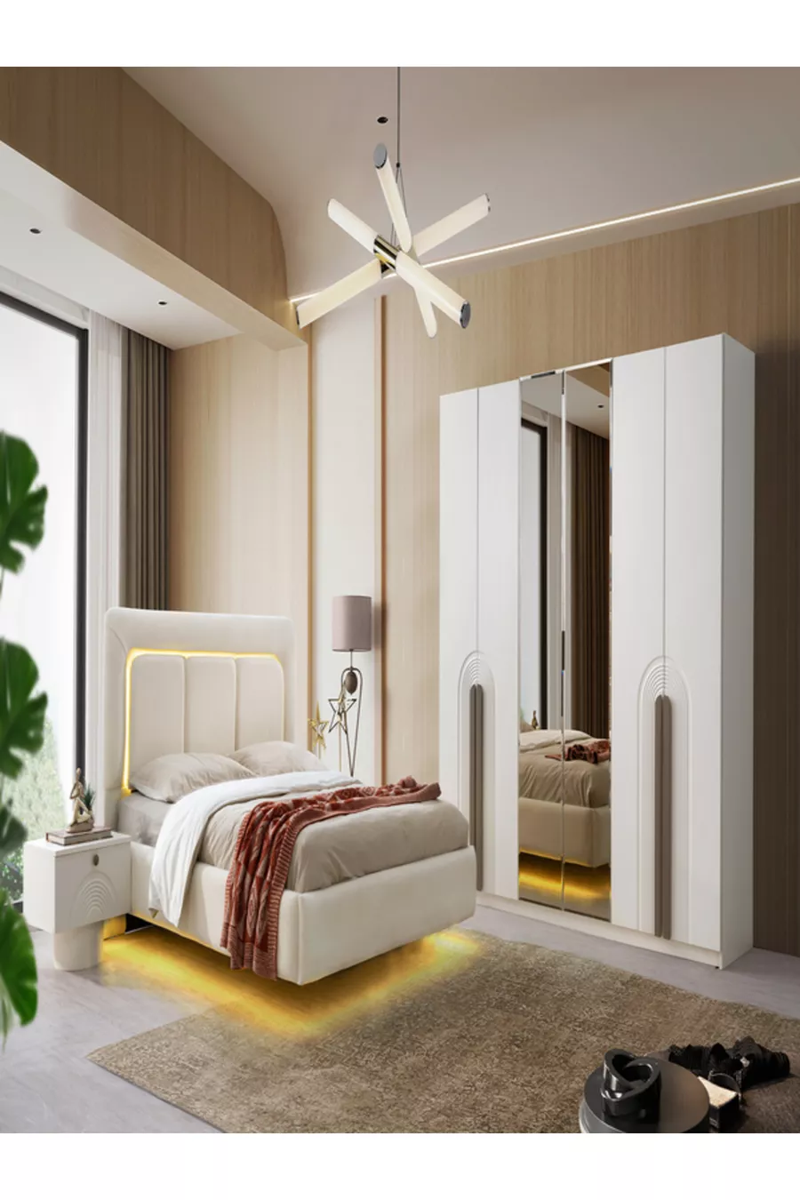 محتوى الطقم: خزانة + 2 من الطاولات الجانبية + كومودينو + رأس سرير