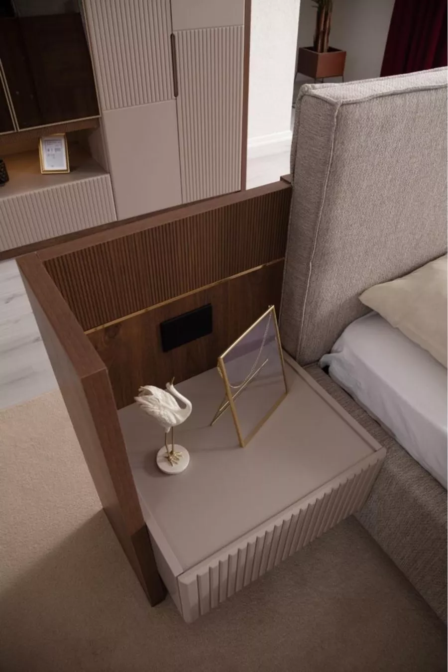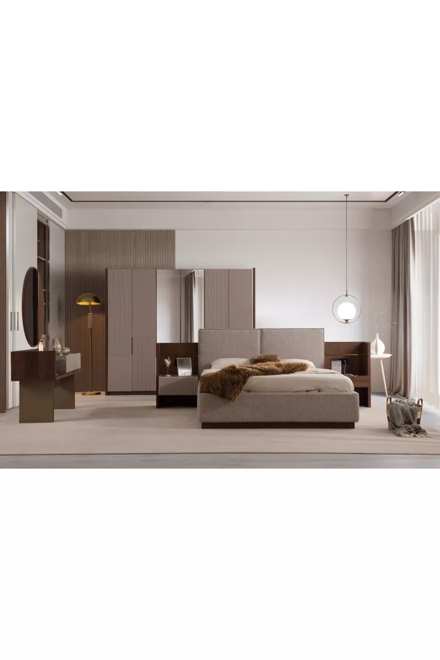 محتوى الطقم: سرير بصندوق تخزين + 2 كومودينو + تسريحة + خزانة