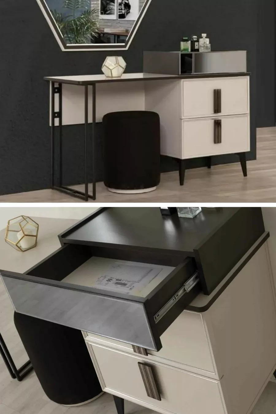 محتويات الطقم: سرير + 2 طاولة جانبية + تسريحة + خزانة + مرآة